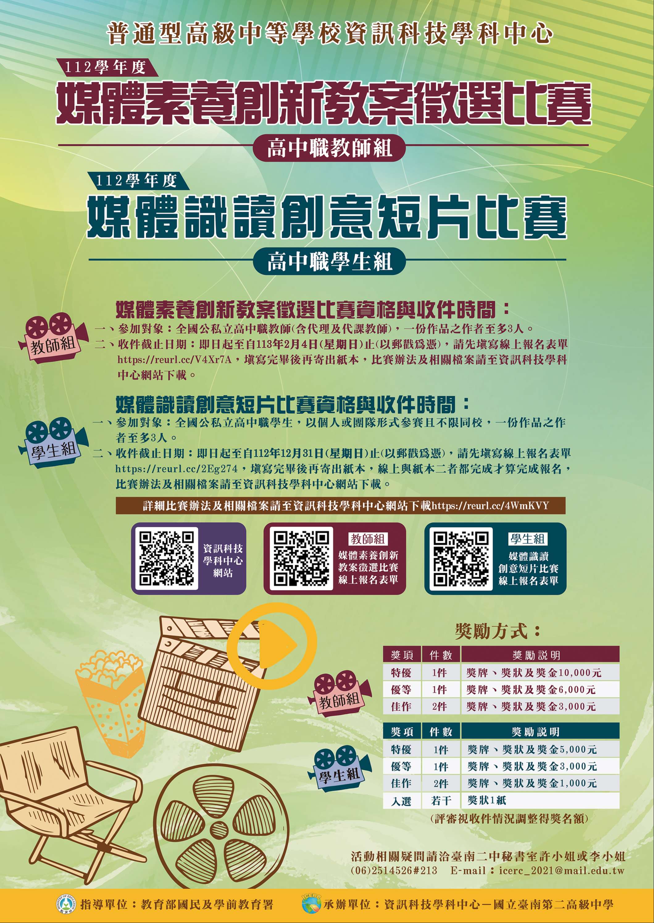 一、依教育部國民及學前教育署112年7月7日臺教國署高字第 1120087119號函核定辦理。 二、報名方式:即日起至112年12月31日(星期日)前,請上網登 錄報名(網址:https://reurl.cc/2Eg274)。 三、參加對象:全國公私立高中職學生。 四、詳情可至高中資訊科技學科中心網站https://reurl.cc /4WmKVY查詢及下載相關檔案。 五、檢附媒體識讀創意短片比賽實施計畫及海報電子檔各1份; 另郵寄紙本海報至各校敬請協助張貼公告。