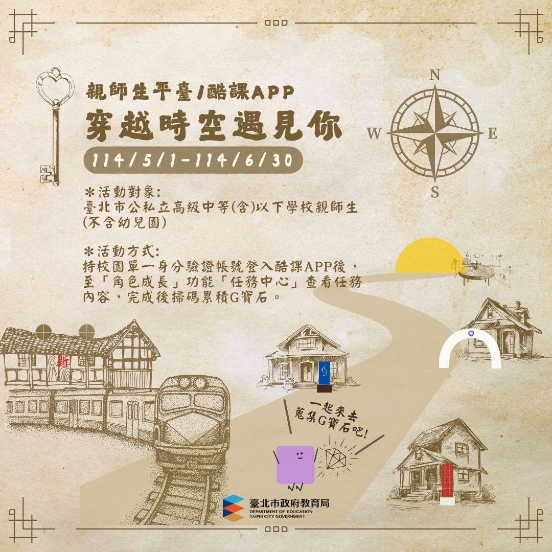 一、本局建置「親師生平臺/酷課APP」,提供本市親師生多元 智慧校園服務,為激勵學生自主學習,本次活動與臺北市5 社教場館合作,於114年5月至6月舉辦「穿越時空遇見你」 活動任務,鼓勵學生實際走訪場館,深入了解臺北市的歷 史發展與在地文化,請貴校鼓勵親師生積極參與。