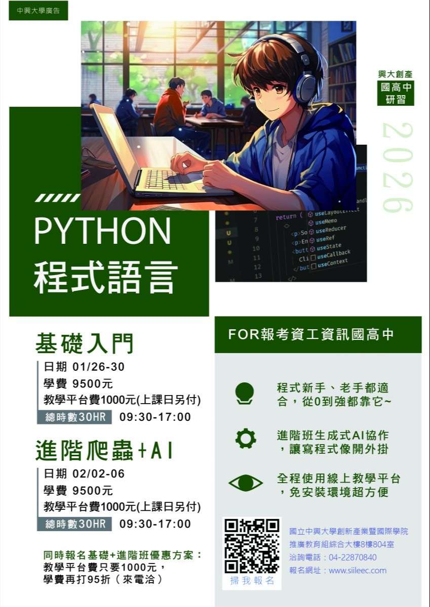 (一)《Python程式設計系列基礎入門/進階爬蟲班》,想靠程 式加身以APCS加分報考資工系所,還有超熱門的 生成 式 AI 協作技巧,從0到強都靠它!讓這堂課成為你的黃 金跳板!