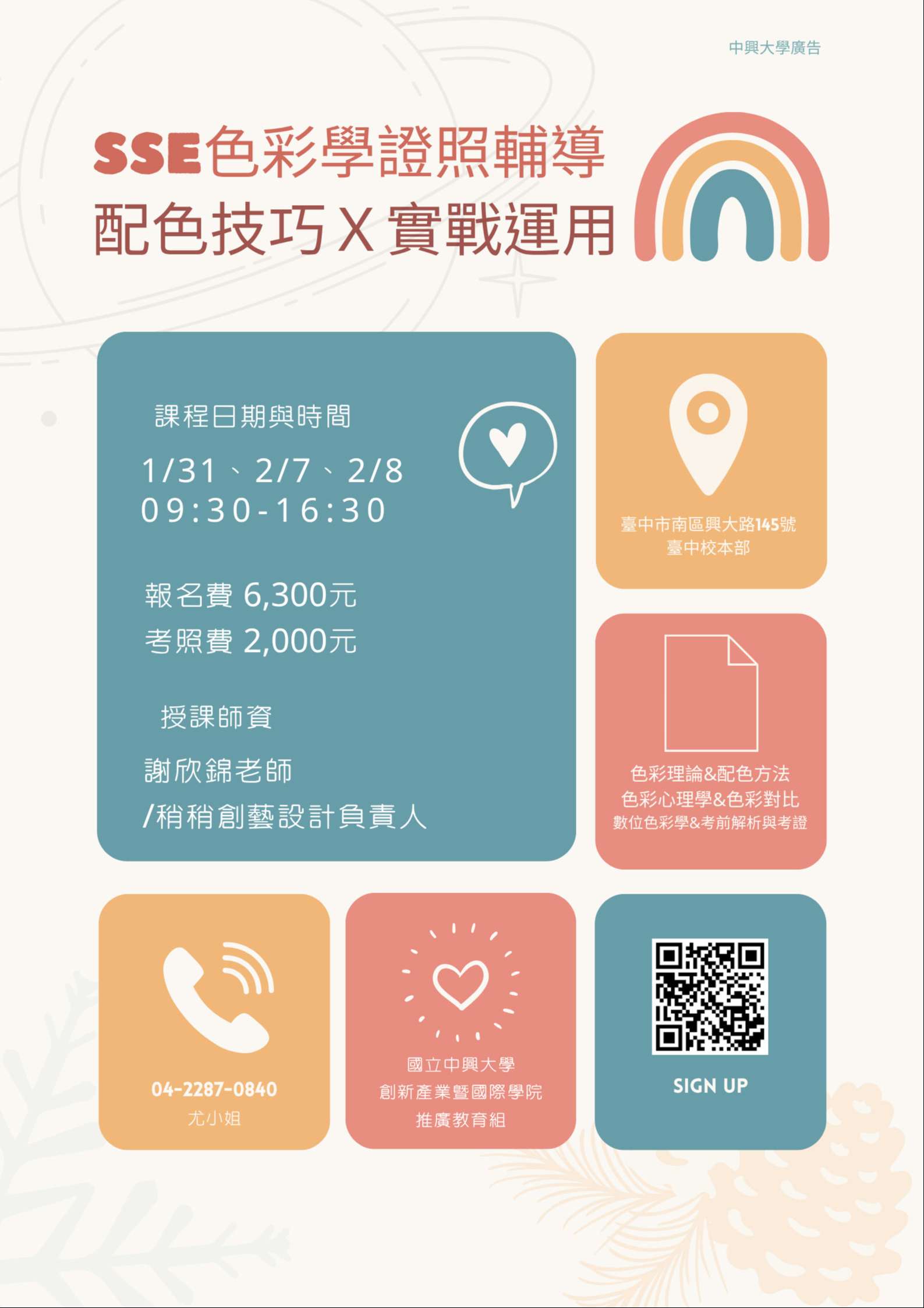 (三)色彩學國際SSE證照輔導:1月31日、2月7日、2月8日三 日營。