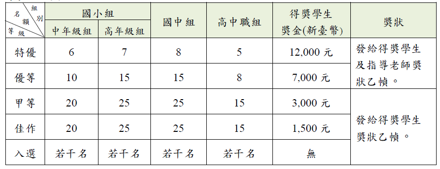 每篇散文字數:國小組約600字,國中組約1,200字,高中職組約1,500字。