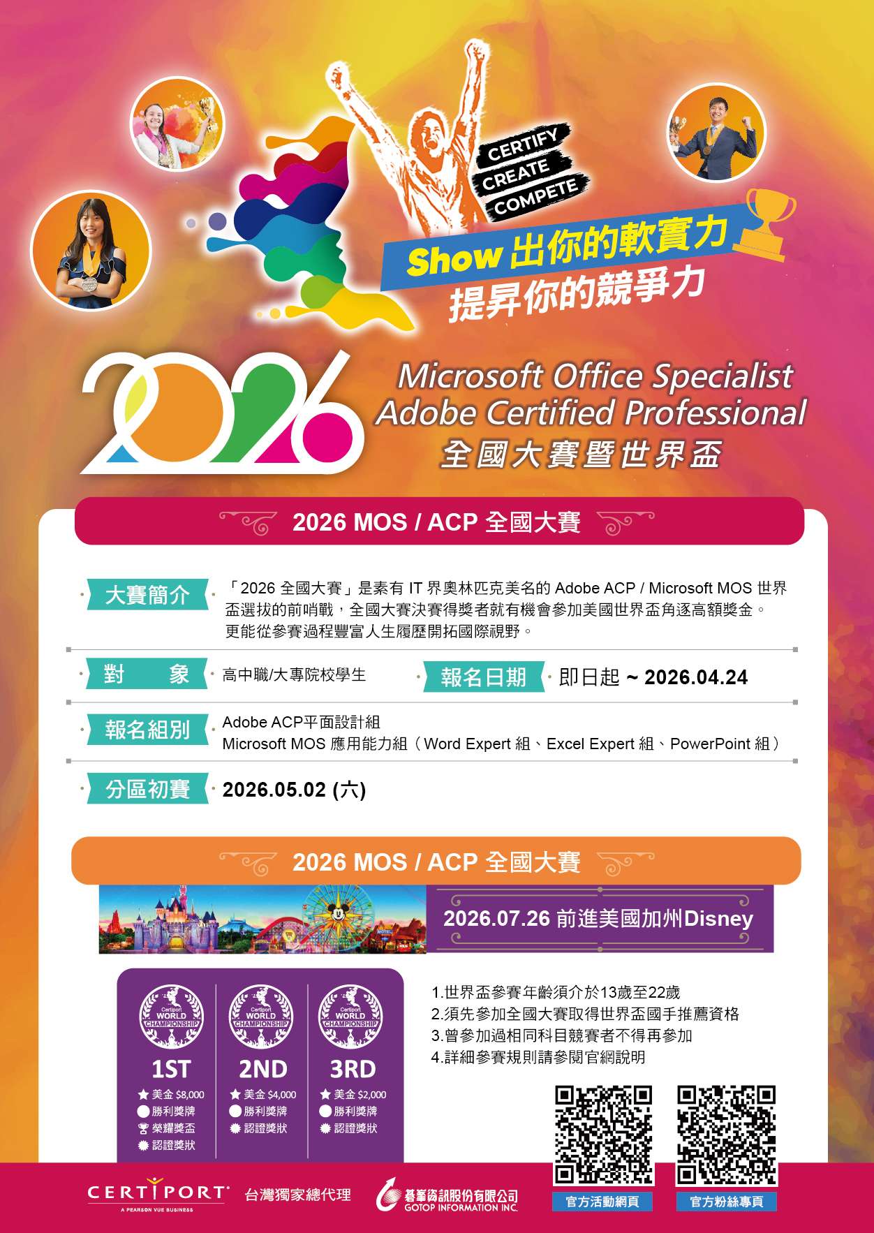 三、「2026 Microsoft MOS / Adobe ACP World Championship 世界盃競賽」係由全球最知名科技巨擘Microsoft、Adobe 與IT專業認證服務商Pearson VUE/Certiport主辦,去年共 有來自108個國家,超過200,000名選手參與本國際賽事, 角逐世界冠軍寶座。 四、本年度世界盃賽事將於2026.07.26~2026.07.29假美國加 州 Disney舉辦全球總決賽,世界盃各競賽科目冠軍獎金為 美金8,000元、亞軍獎金為美金4,000元、季軍獎金為美金 2,000元。