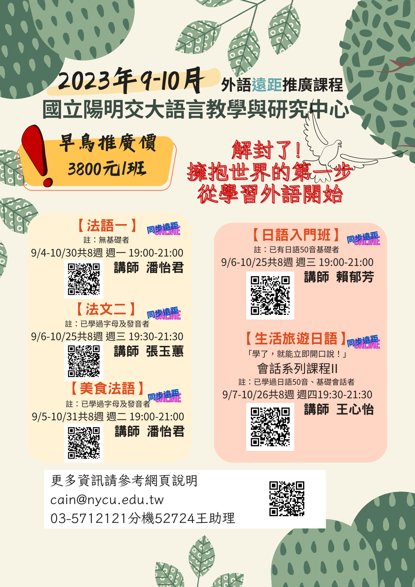 五、課程負責人:王秀勻助理,聯絡電話:(03)5712121分機52724,聯絡信箱:cain@nycu.edu.tw。