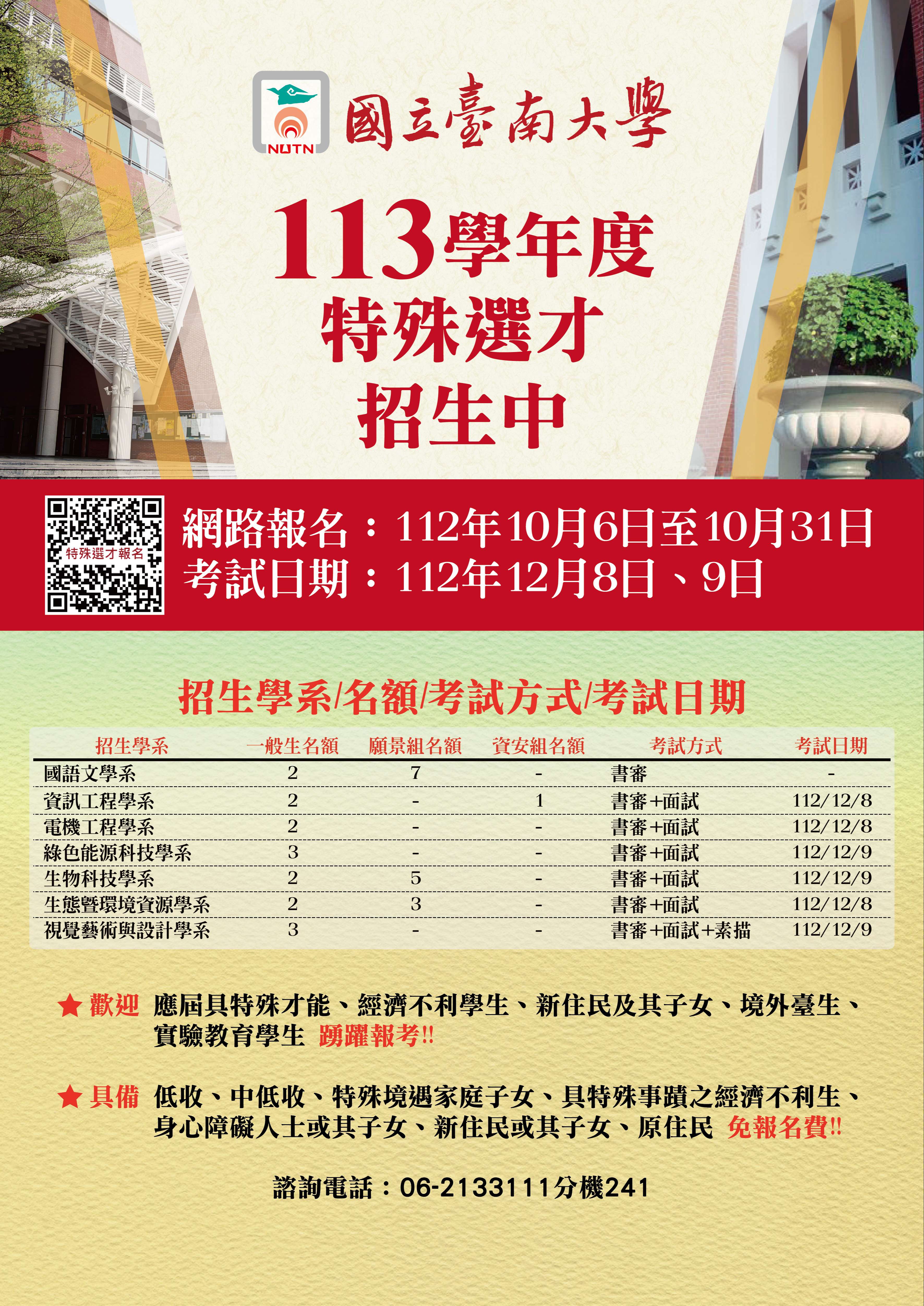 一、招生簡章已公告於報名網站,請考生可上網自行查閱,網 址:https://admissions.nutn.edu.tw/sRecruit/。