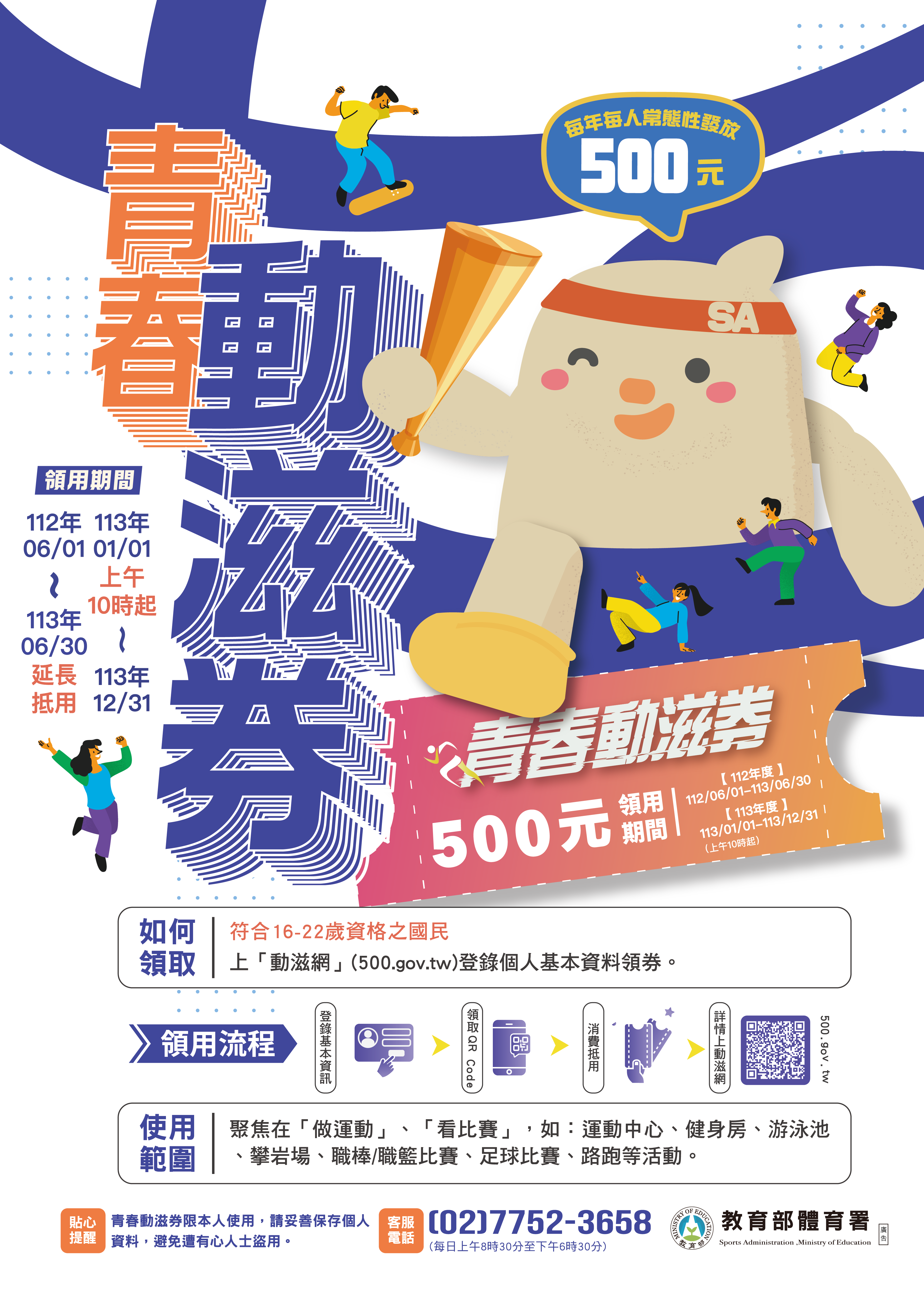 三、青春動滋券相關資訊可上動滋網(500.gov.tw)查詢,或電洽客服專線7752—3658(每日上午8時30分至下午6時30分)。