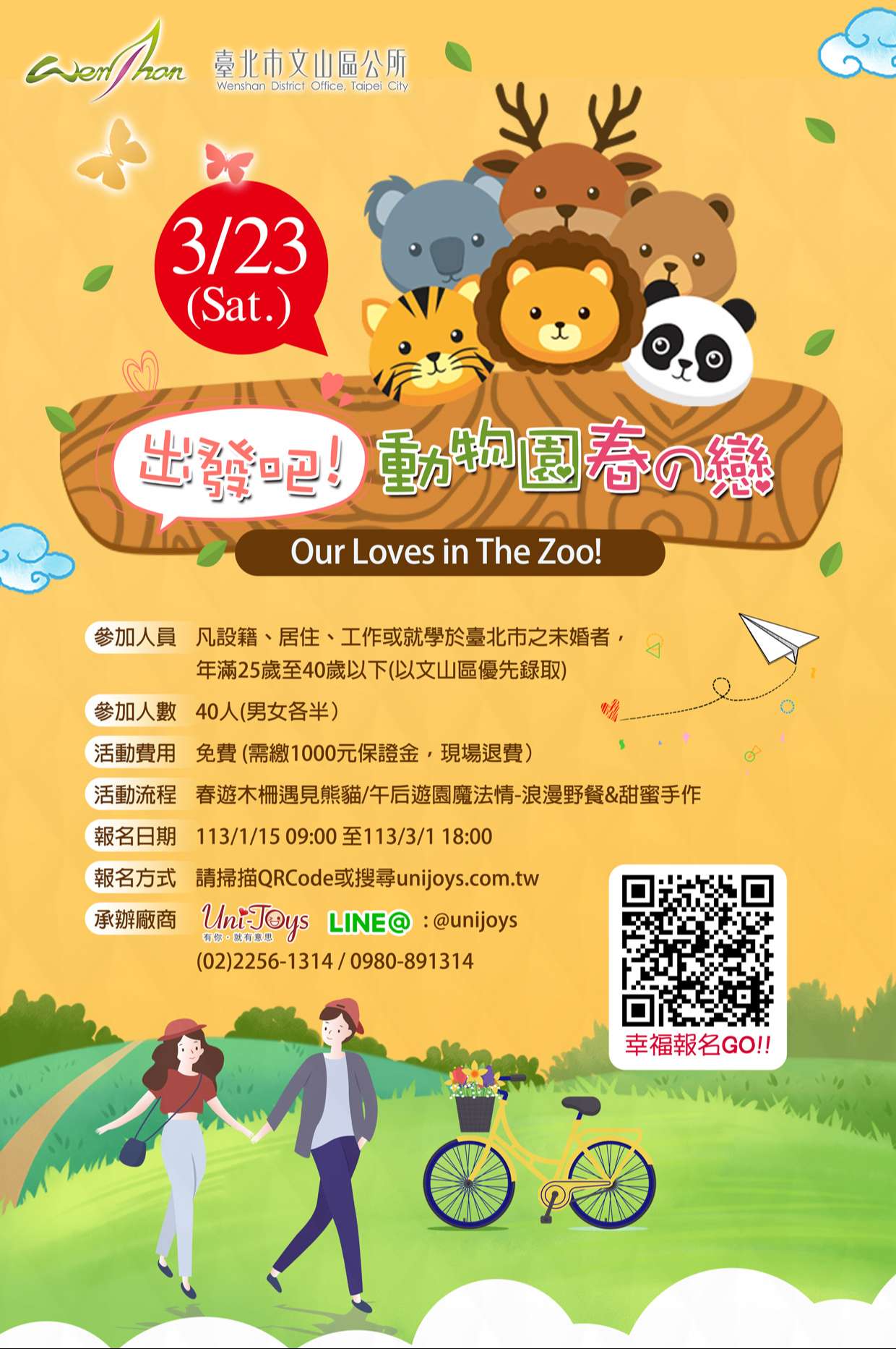 二、臺北市文山區公所113年度單身聯誼活動『出發吧!動物園春の戀』,將於113年3月23日(星期六)下午13時至17時假臺北市立動物園辦理,線上報名時間自113年1月15日(星期一)起至113年3月1日(星期五)或額滿為止,凡年滿25歲至40歲以下,總計40個名額,男女各20人,免費參加,活動詳情請見官網或電洽2936-5522轉355吳小姐。