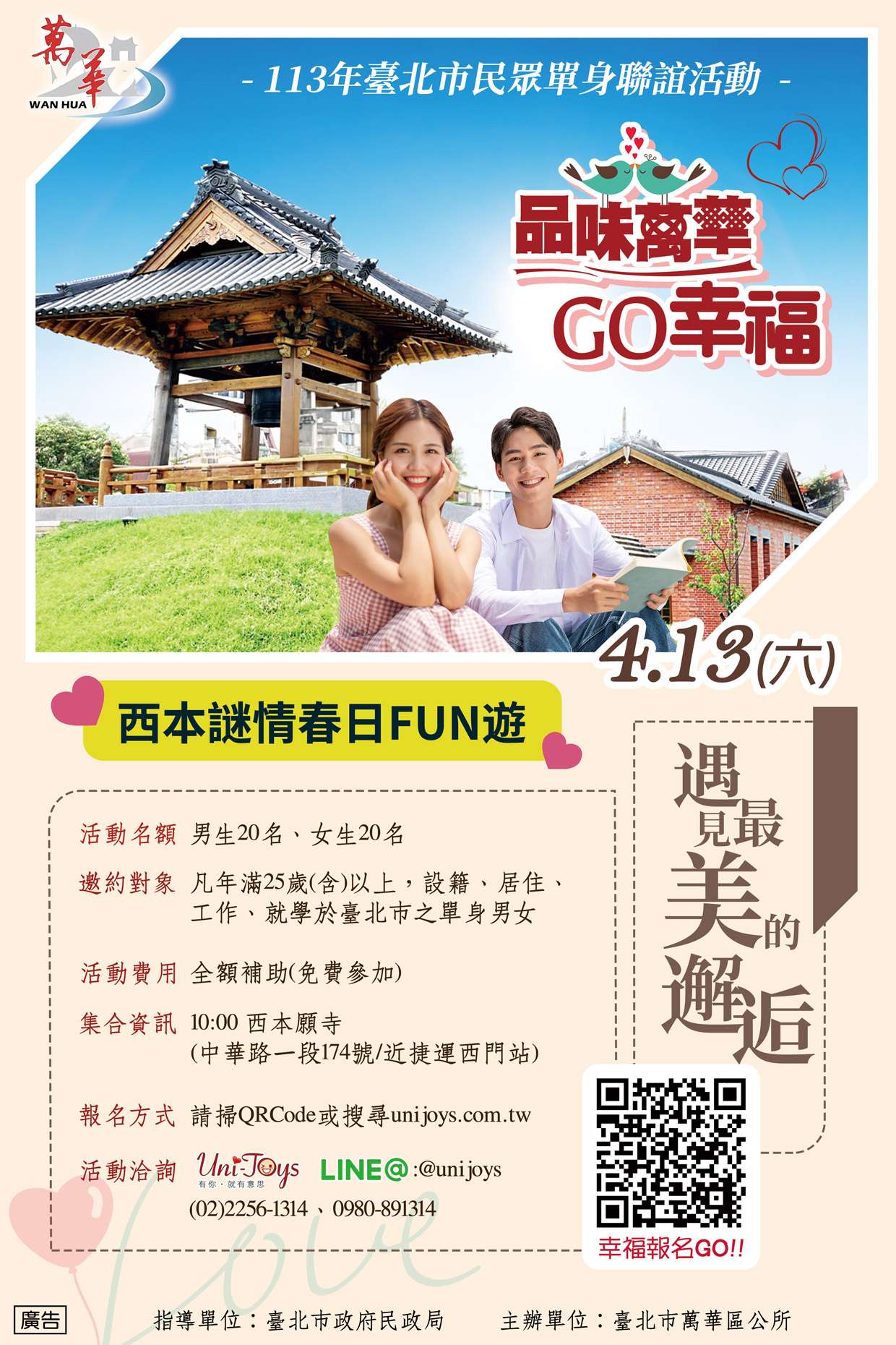臺北市萬華區公所113年度單身聯誼活動,將於113年4月 13日(星期六)上午10時至下午4時時假『臺北市天后宮、 西本願寺、西門町商圈』舉辦,線上報名時間自即日起至 113年4月5日(星期五)或額滿為止,凡年滿25歲以上,在 臺北市居住、工作或就學,並且有穩定工作(以萬華區者 優先錄取),總計40個名額,男女各20人,免費參加,活 動詳情請見萬華區公所官網或電洽2306-4468轉204陸先 生。