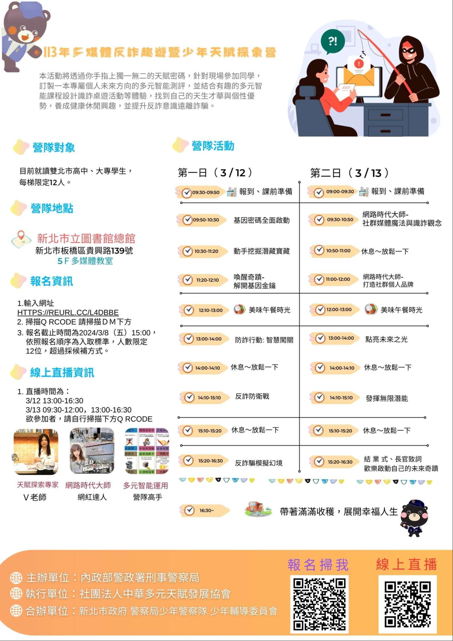 (七)報名方式:採線上報名(連結如附件),報名完成後並 將相關報名資料及家長同意書交由學校生輔組長轉刑事警察局預防科彙辦(以利學校及承辦機關了解學生勤惰狀況)。