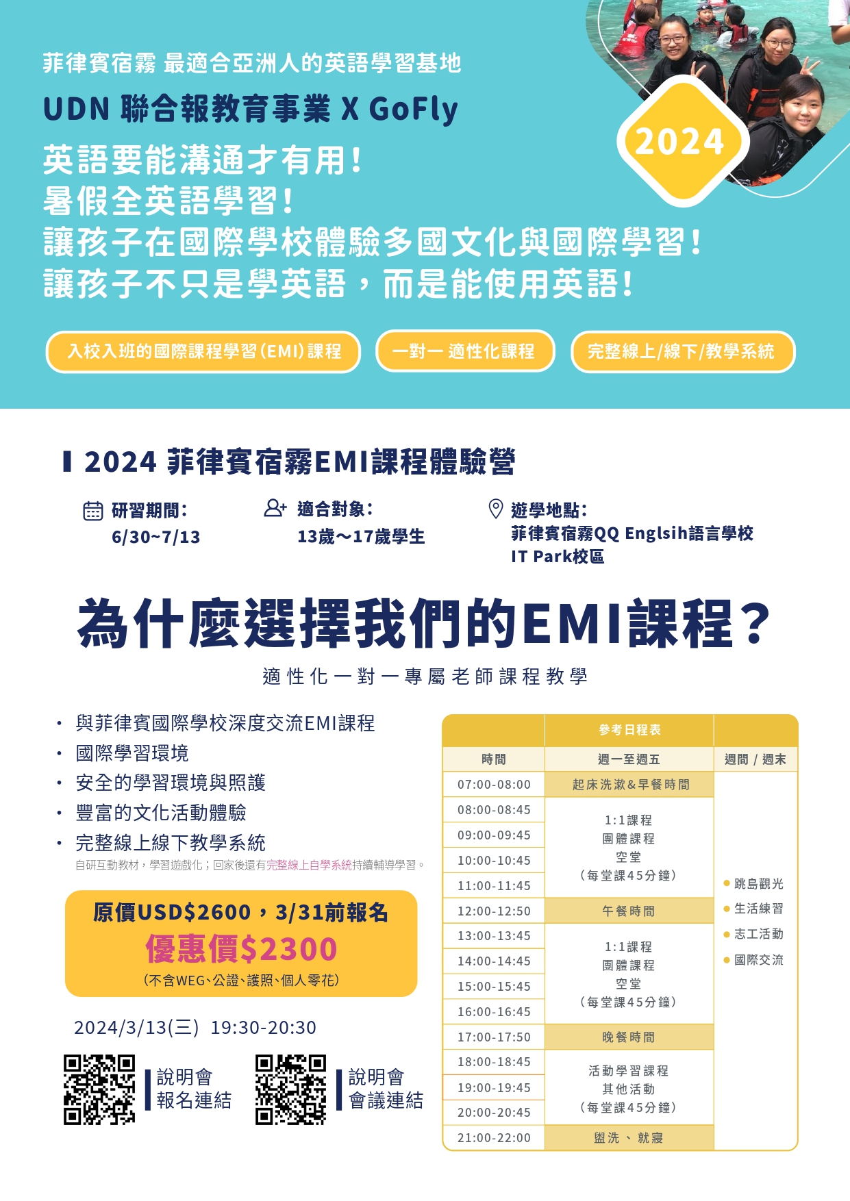 今年暑假6/30(日)~7/13(六),聯合報辦理暑期兩週菲