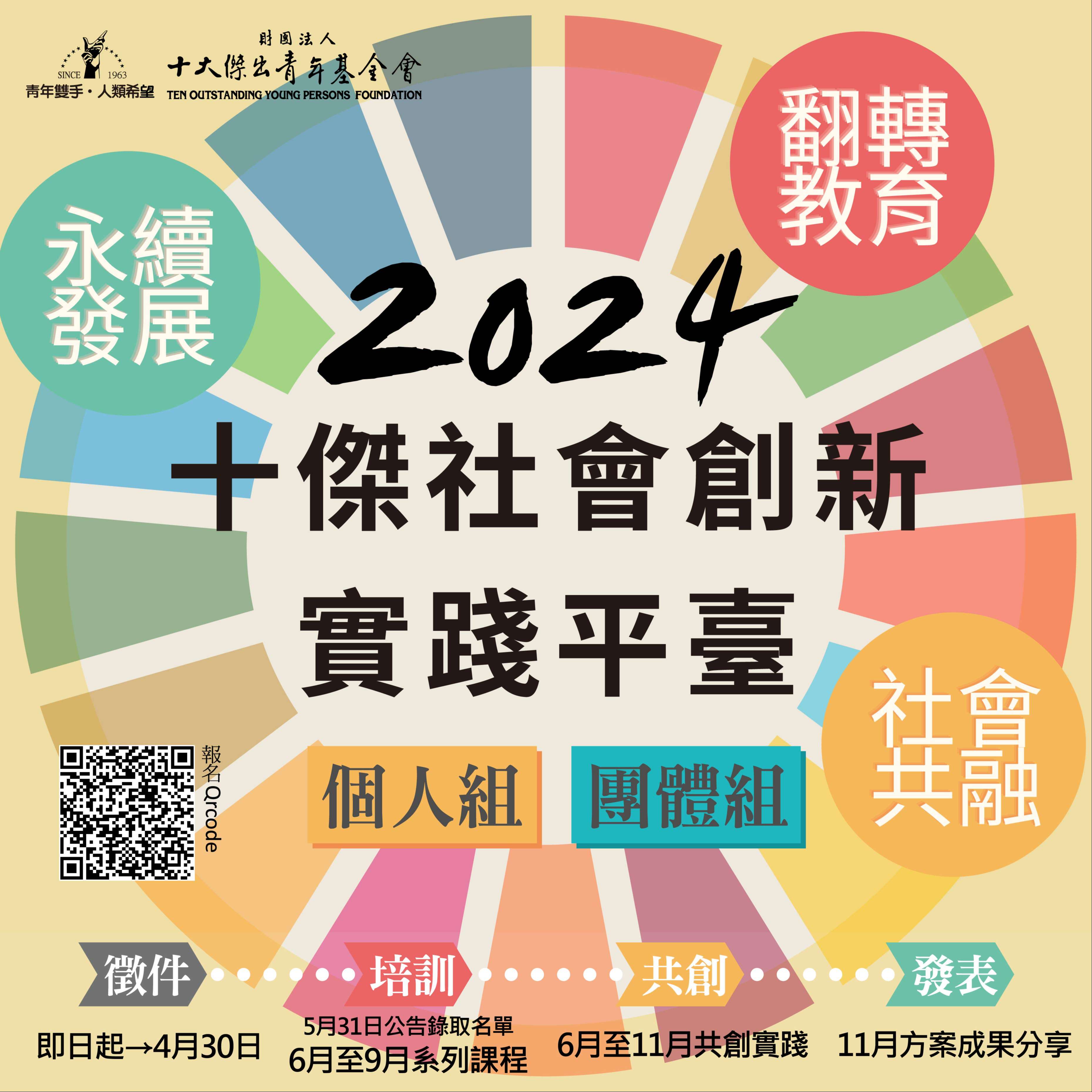 二、2024年「十傑社會創新實踐平臺計畫」以「永續發展」、 「翻轉教育」、「社會共融」三大面向作為本年度徵件主題,鼓勵青年提出具創新、影響力的社會實踐方案並以具體行動回應並嘗試解決各種社會問題。