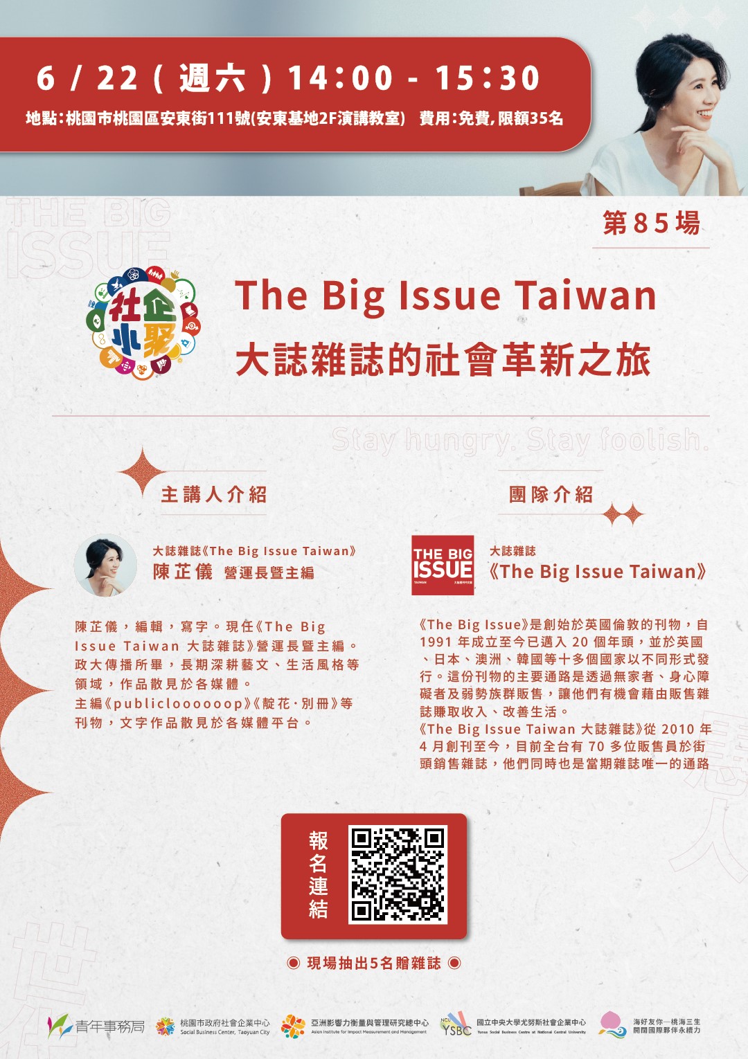 一、「桃園社企小聚第85場-大誌雜誌的社會革新之旅」(以下簡稱本活動)由桃園市政府青年事務局、桃園市政府社會企業中心、國立中央大學亞洲影響力衡量與管理研究總中心、國立中央大學尤努斯社會企業中心及海好友你-桃海三生開闊國際夥伴永續立共同舉辦。
