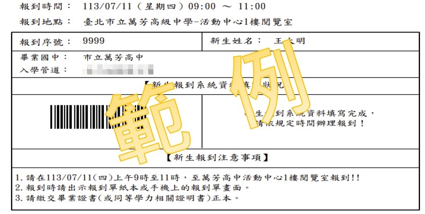請在 7/09(二) 11:00 起至 7/11(四) 09:00 前,先至「高中校務行政系統」完成線上報到(確認基本資料、上傳畢業證書電子檔)。新生報到流程之系統操作可參閱附加檔案之說明,系統網址:https://sschool.tp.edu.tw 。