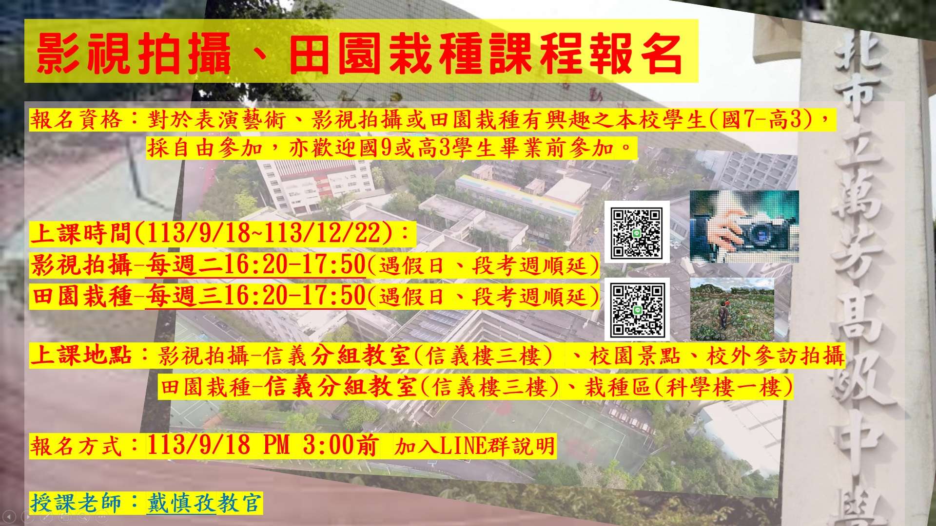 報名資格:對於表演藝術、影視拍攝或田園栽種有興趣之本校學生(國7-高3), 採自由參加,亦歡迎國9或高3學生畢業前參加。