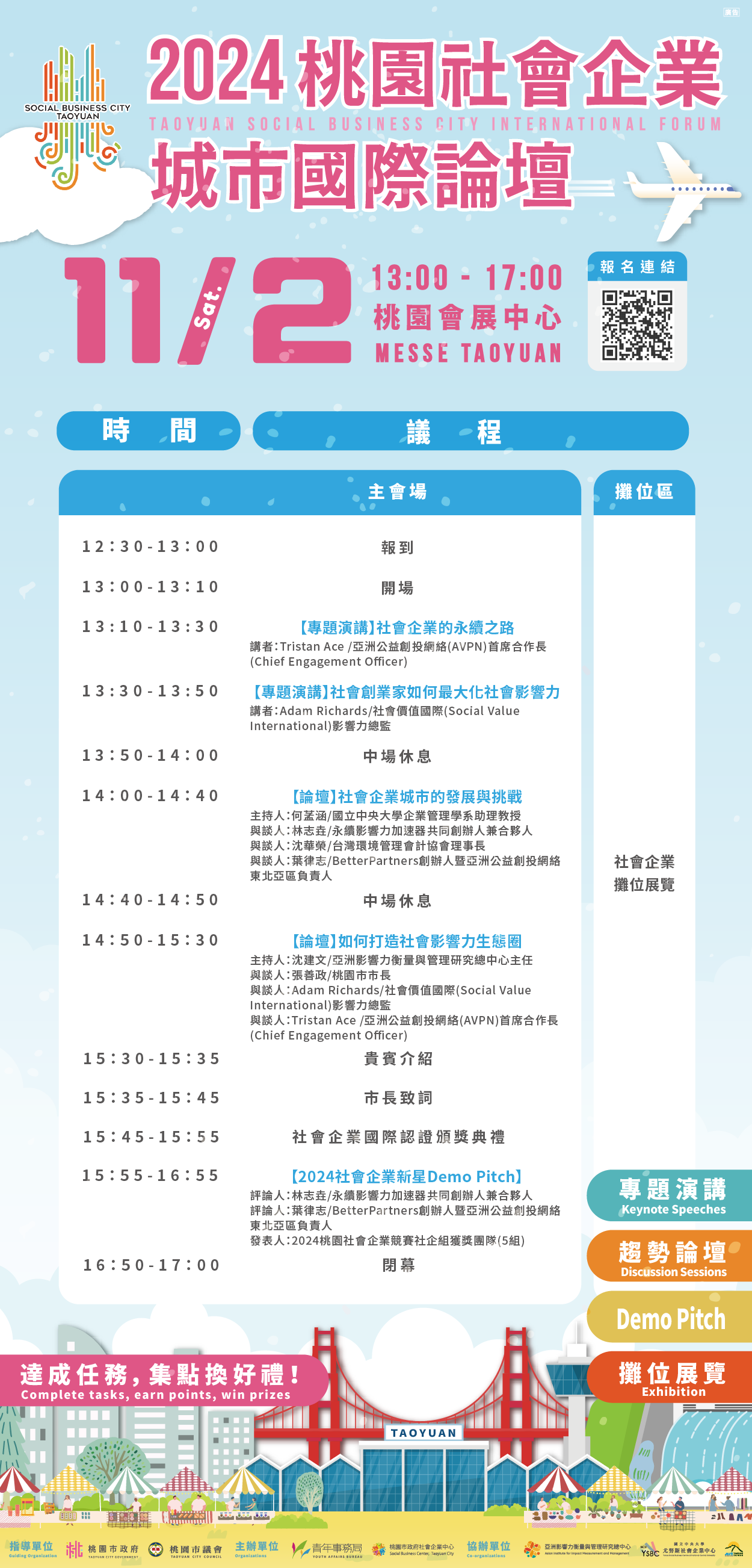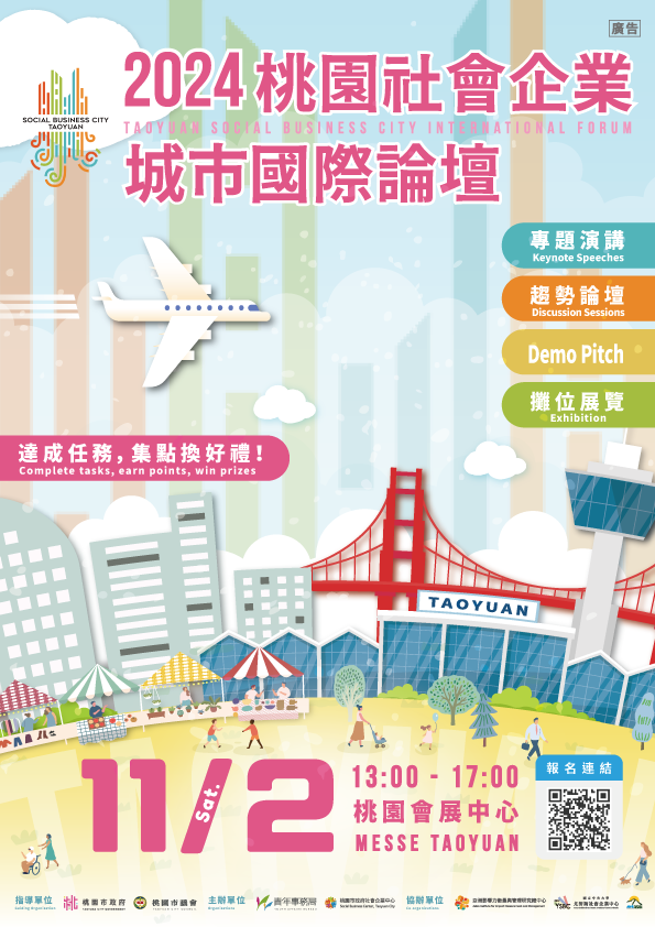 一、「2024桃園社會企業城市國際論壇」訂於中華民國113年11 月2日(星期六)13:00至17:00,於桃園會展中心(桃園市中壢區領航北路一段99號)舉辦,即日起至113年10月30日 (星期三)止受理報名。 二、本活動提供公務人員終身學習時數4小時、全國高中及大專院校學生服務學習時數4小時。