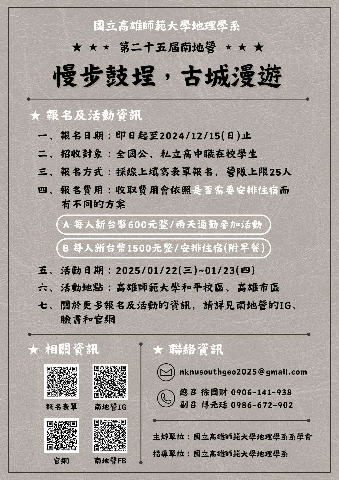 一、本校地理學系系學會舉辦「第二十五屆高師大南地營〈慢步鼓埕,古城漫遊〉」營隊,兩天營期安排地理教育課程及高雄市鹽埕區和鼓山區之實地考察活動,及結合兩者實地考察活動相關的地理資訊系統(GIS)課程。本營隊希望藉由走訪具有地理議題的地點,與多元的課程及活動,使高中生體驗不同於學校課程的方式,來接觸地理這門學科的相關內容,並且能多認識高雄市。