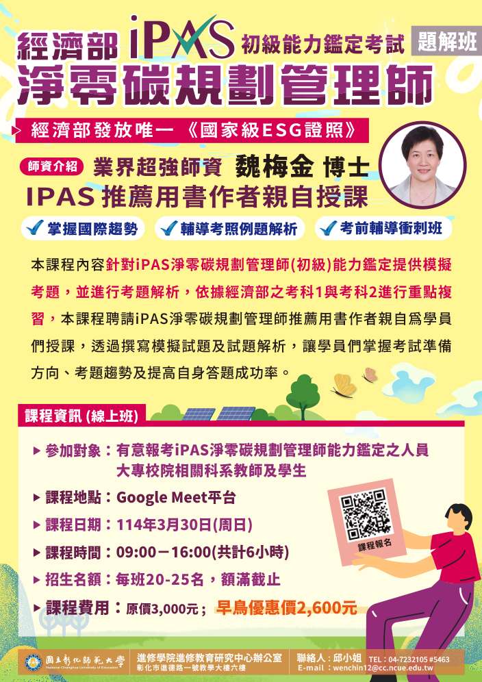 一、「114年iPAS淨零碳規劃管理師(初級)能力鑑定輔導班(第