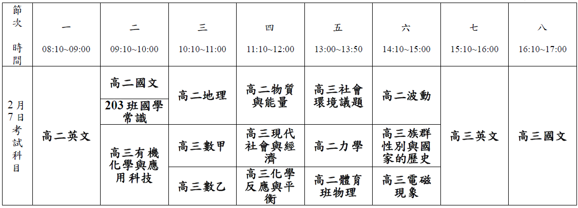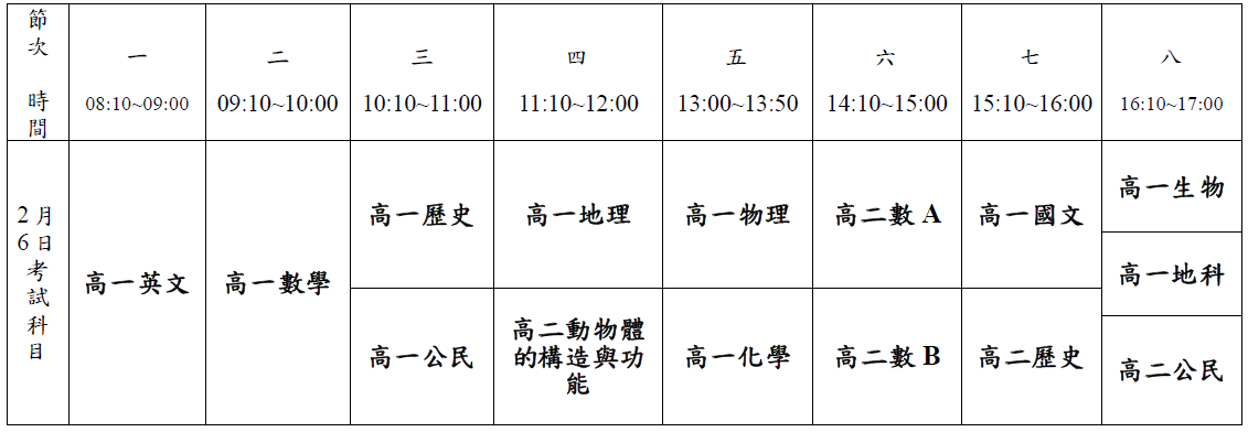 3.高中部統一補考時間為2月6日(四)、2月7日(五),詳情請見附件考程表。考生請務必攜帶學生證(或附有相片之身份證、健保卡,需可辨識照片)應考;未補查驗證件者視同缺考,該科不予計分。