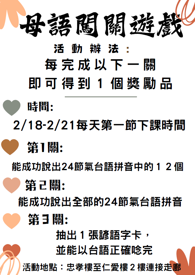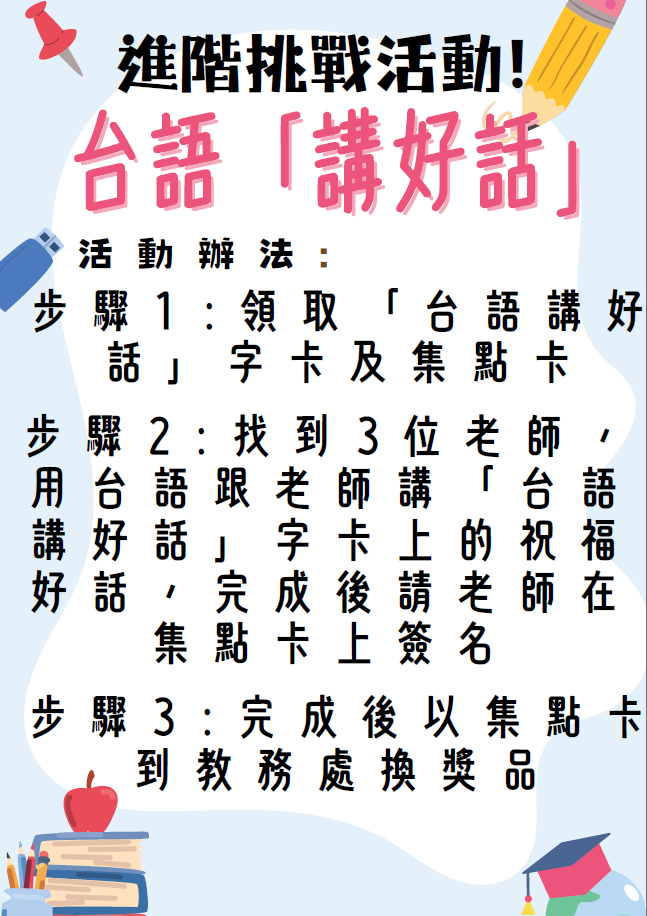 有「母語闖關活動」、「台語『講好話』」歡迎同學踴躍參與!詳情請見下列海報: