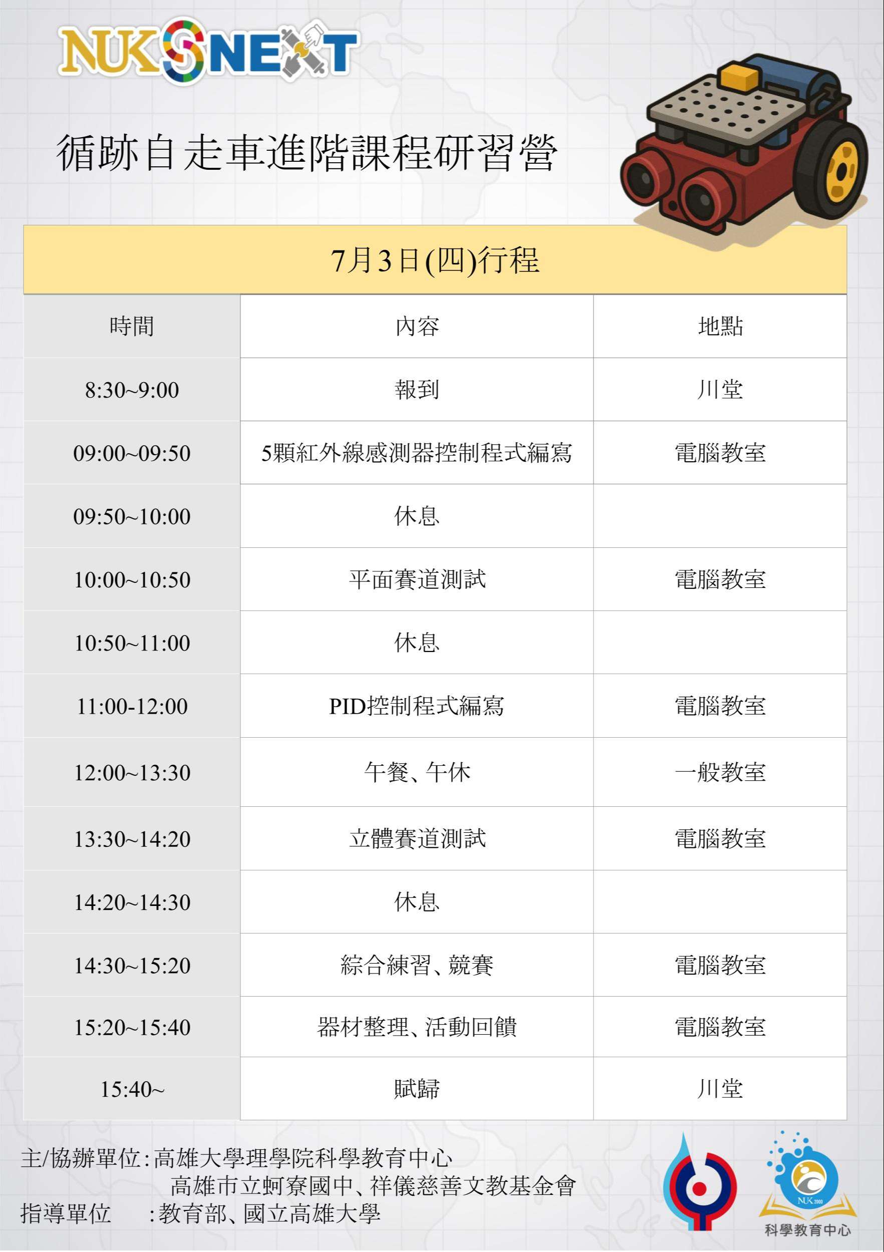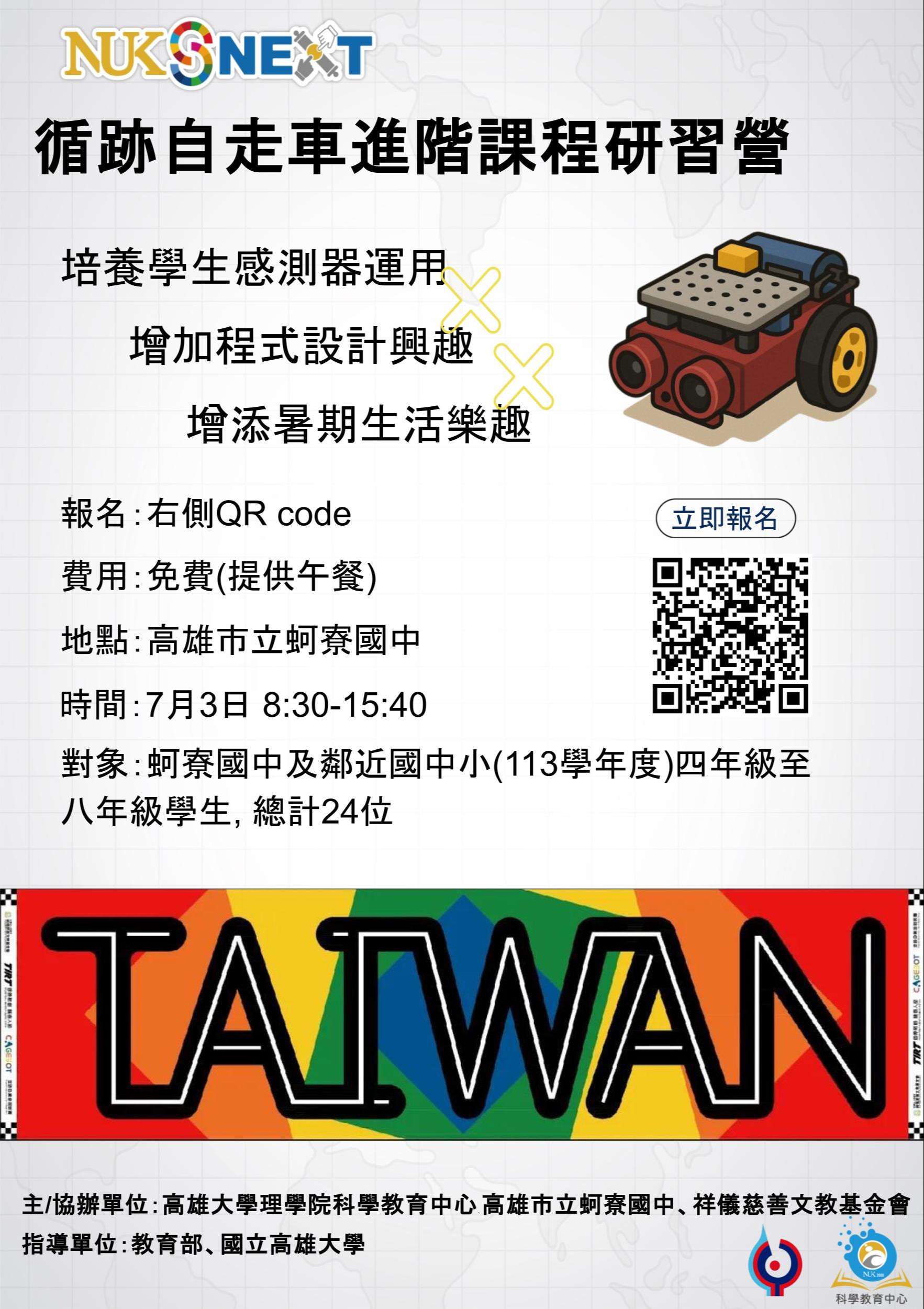 主旨:國立高雄大學科學教育中心擬辦理「循跡自走車進階課程研習營」 活動乙場,敬邀貴單位協助推廣並鼓勵學生踴躍參加,詳 如說明,請查照。