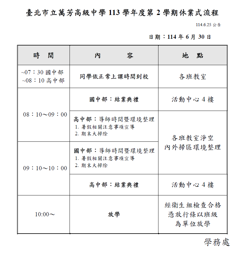 休業式經安排領獎同學,國中部請於8:00、高中部請於9:00