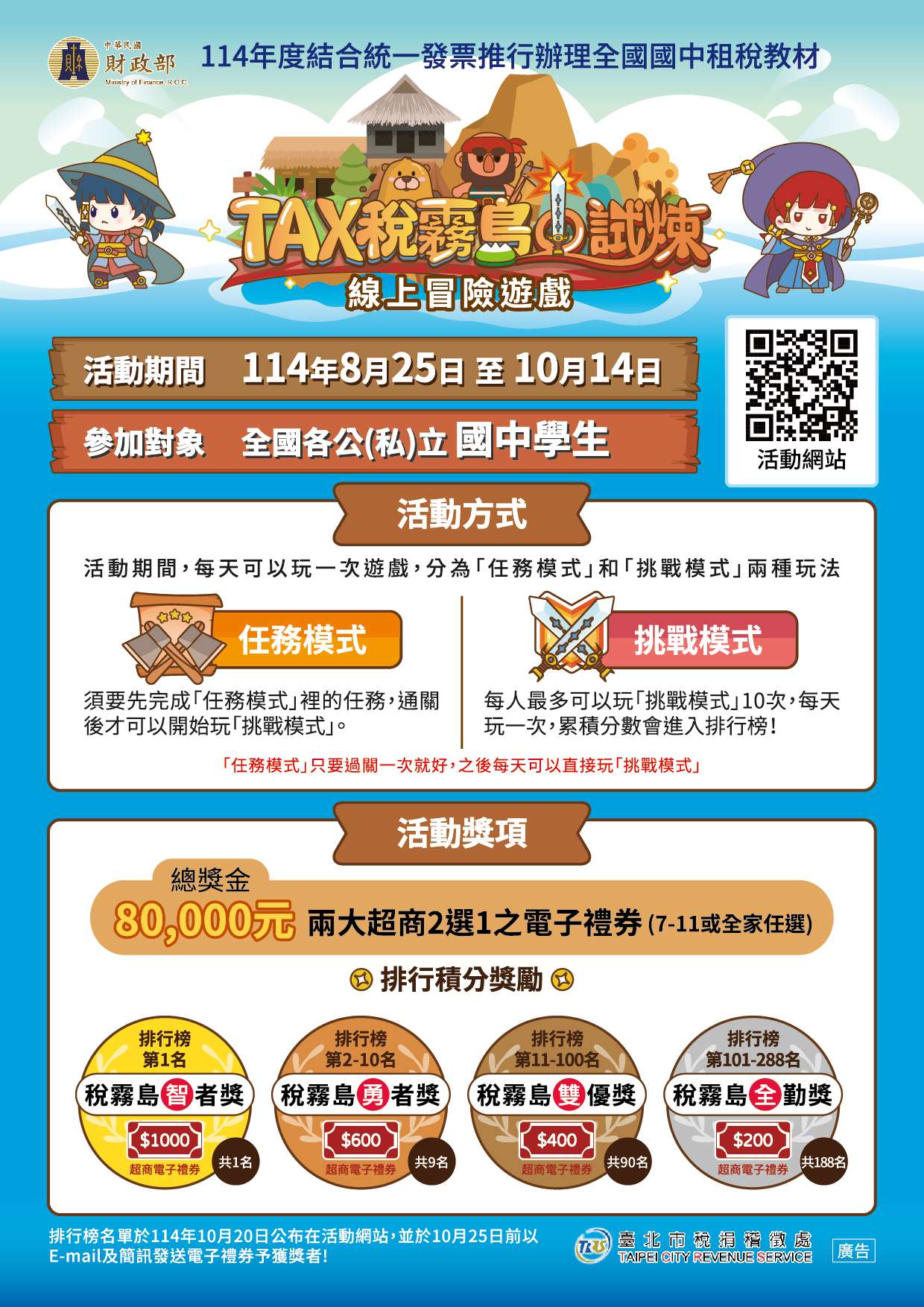 (三)內容:分為「任務模式」與「挑戰模式」兩種玩法,活動詳情請上活動網站(https://www.gotax.tw/tax2025 /)或「北市稅處」粉絲專頁(https://www.facebook. com/tpctax/?locale=zh_TW)查詢。