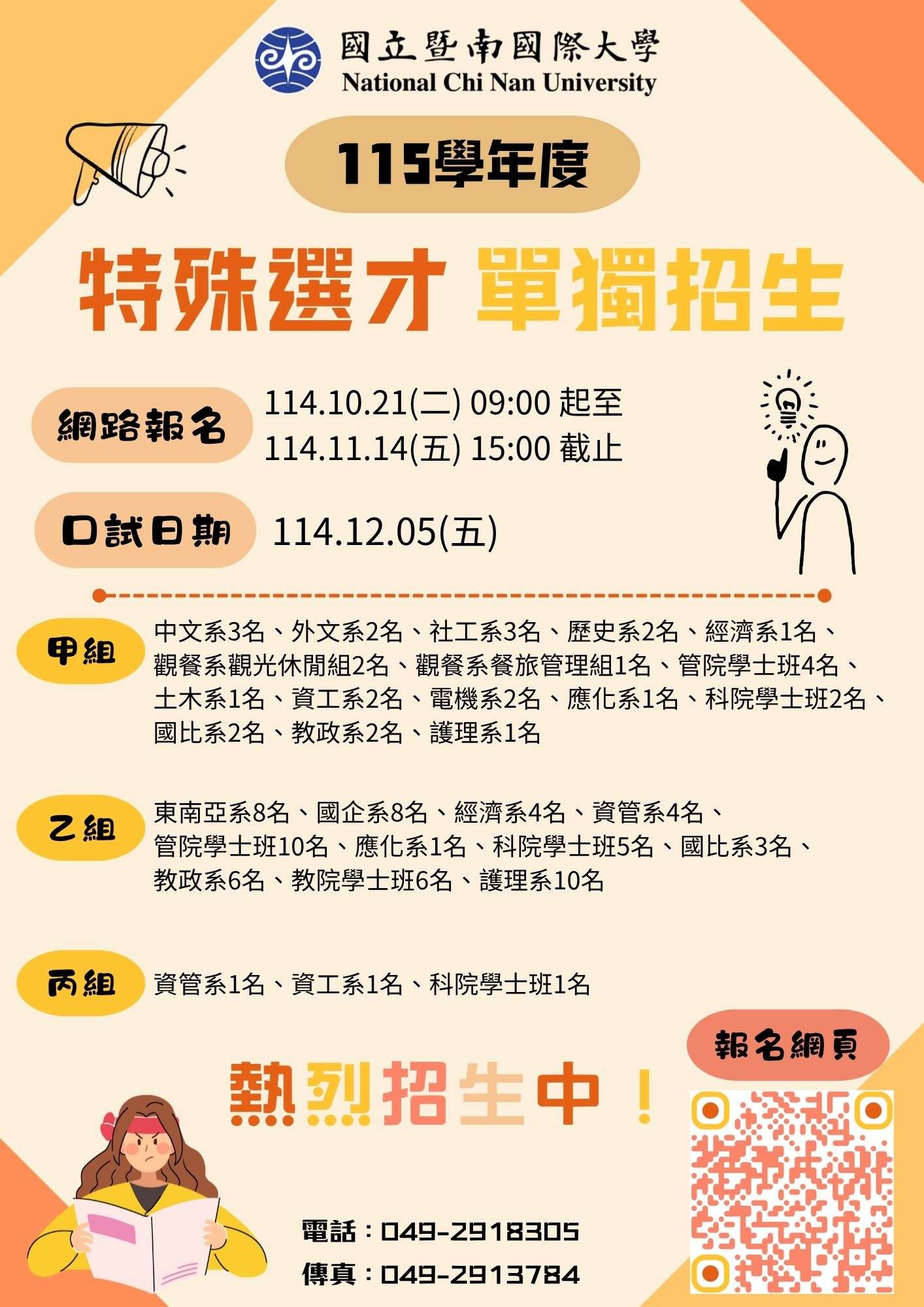 轉知國立暨南國際大學115學年度特殊選才單獨招生訊息