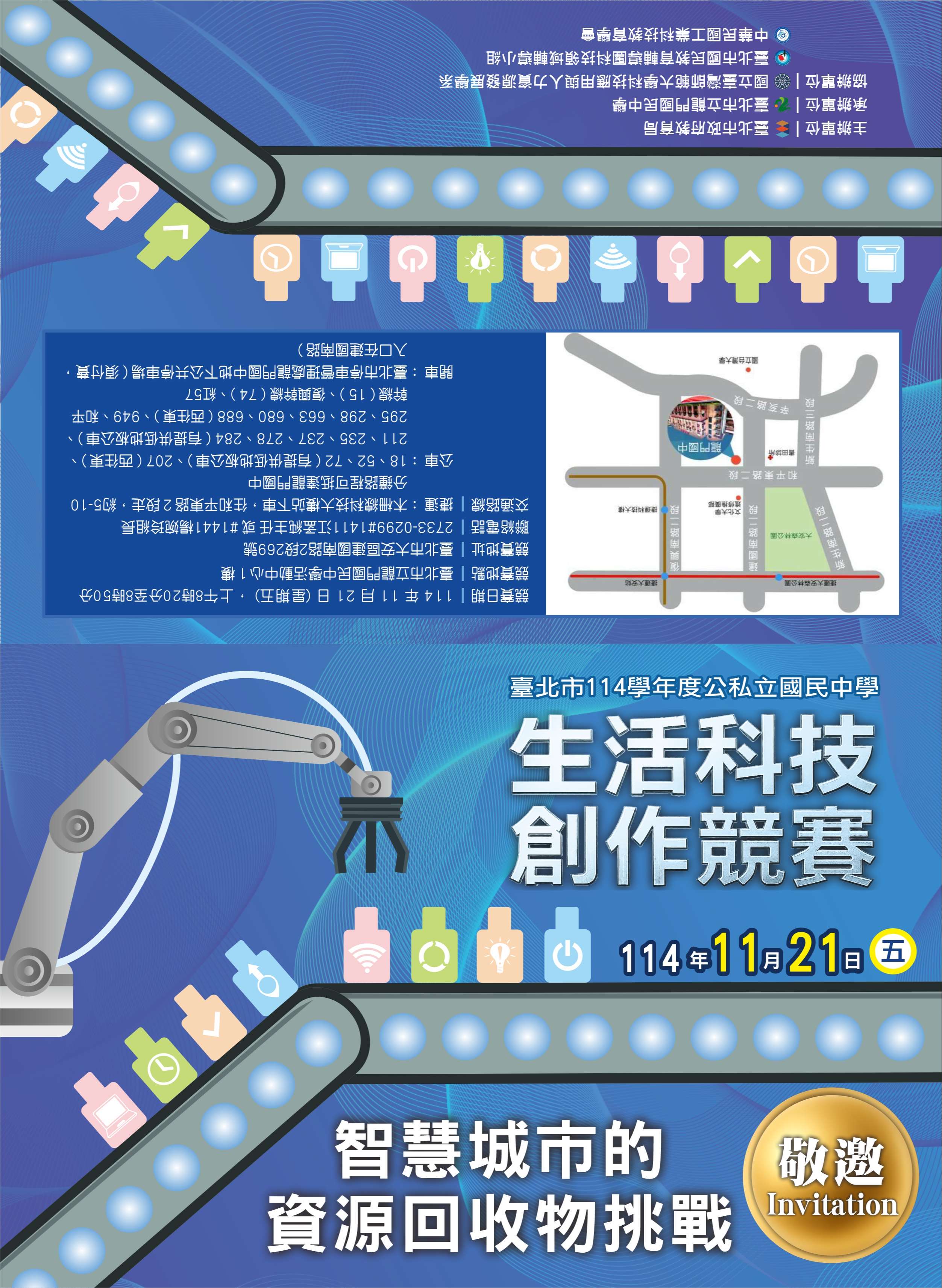 主旨:臺北市立龍門國民中學承辦臺北市「114學年度公私立國民中學生活科技創作競賽」暨頒獎典禮,敬邀長官及貴賓蒞臨指導。