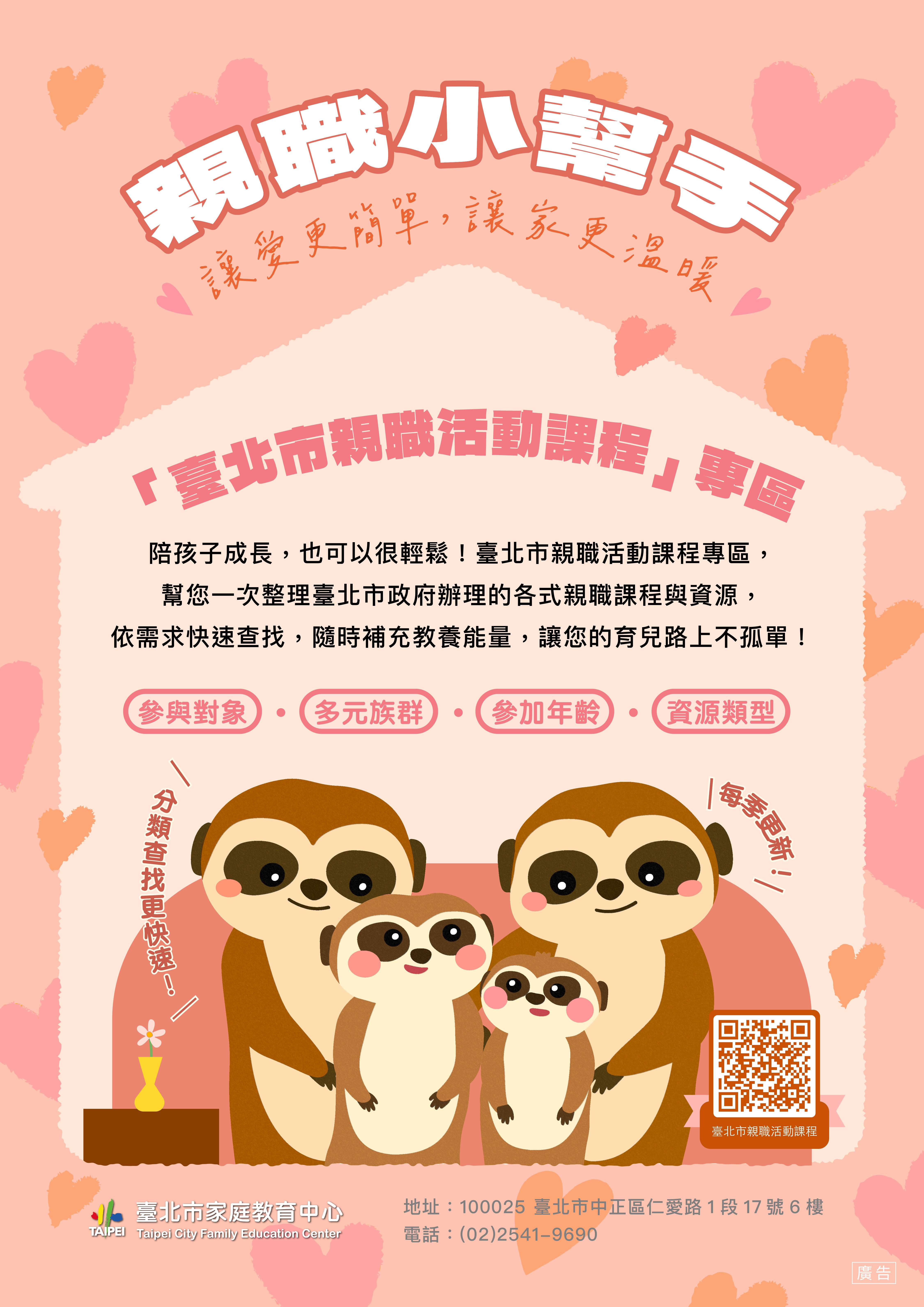臺北市家庭教育中心推出「臺北市親職活動課程專區」,彙整各類親職課程與活動資源,依需求分類,方便家長快速查找,歡迎多加點閱。