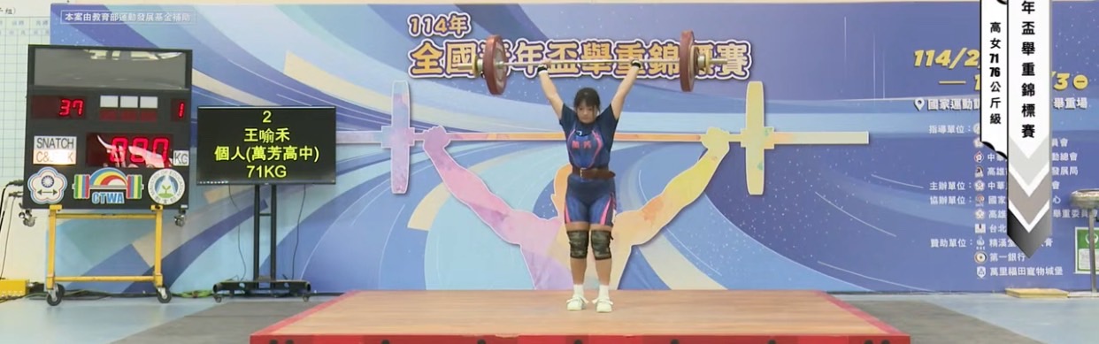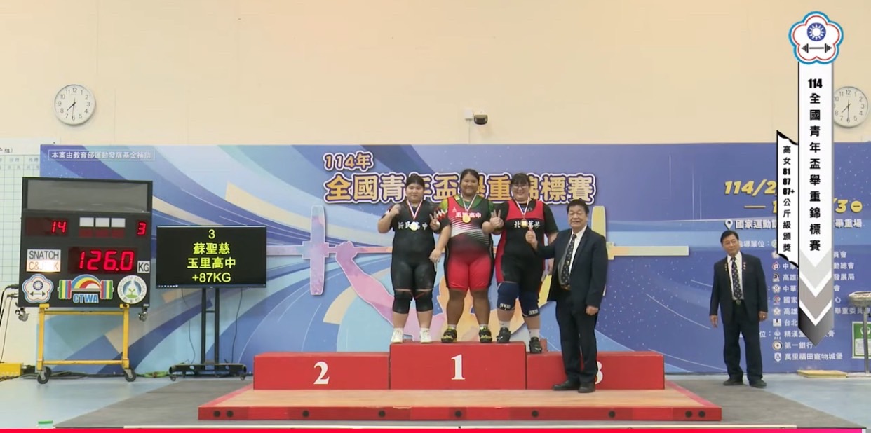 114年全國青年盃舉重錦標賽S111王喻禾高女71kg第四名S311林彣臻高女+87kg第三名S311陳世綸高男55kg第三名