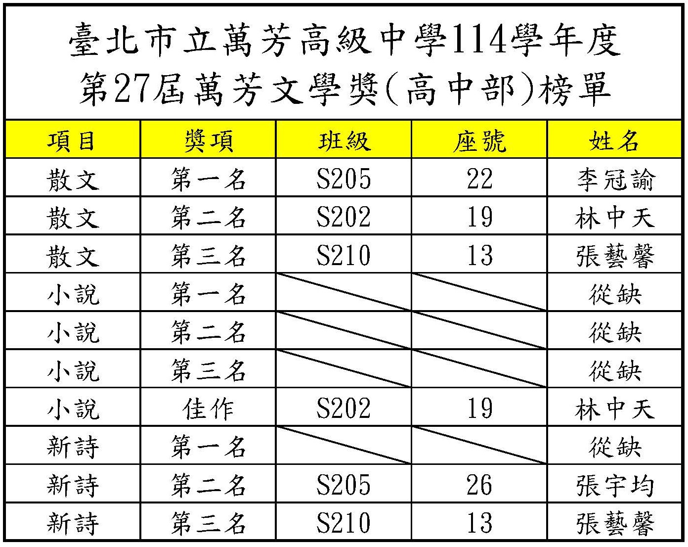 114學年度第27屆萬芳文學獎榜單如下