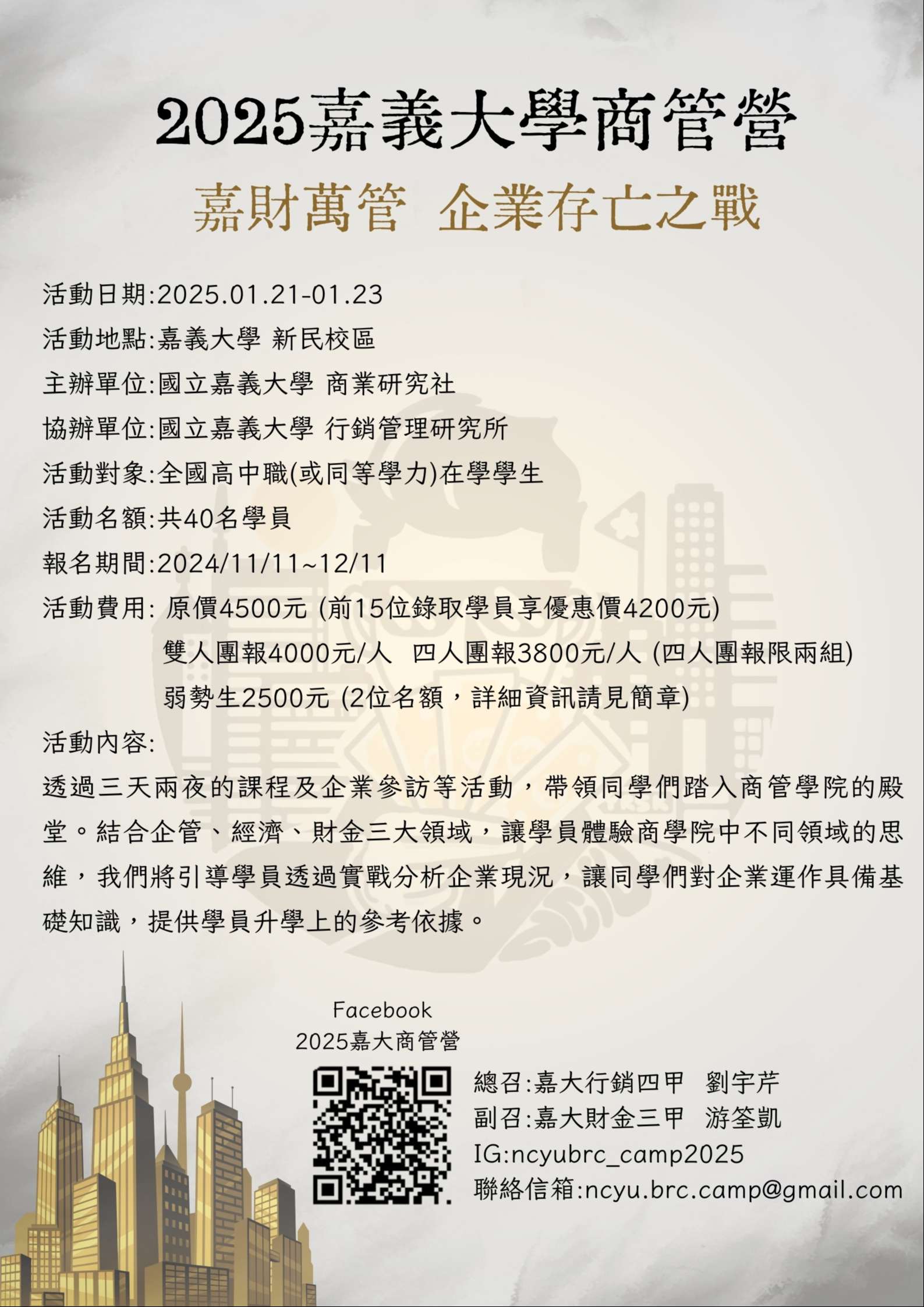 轉知國立嘉義大學商業研究社將於114年寒假辦理「商管營-嘉財萬管」營隊活動