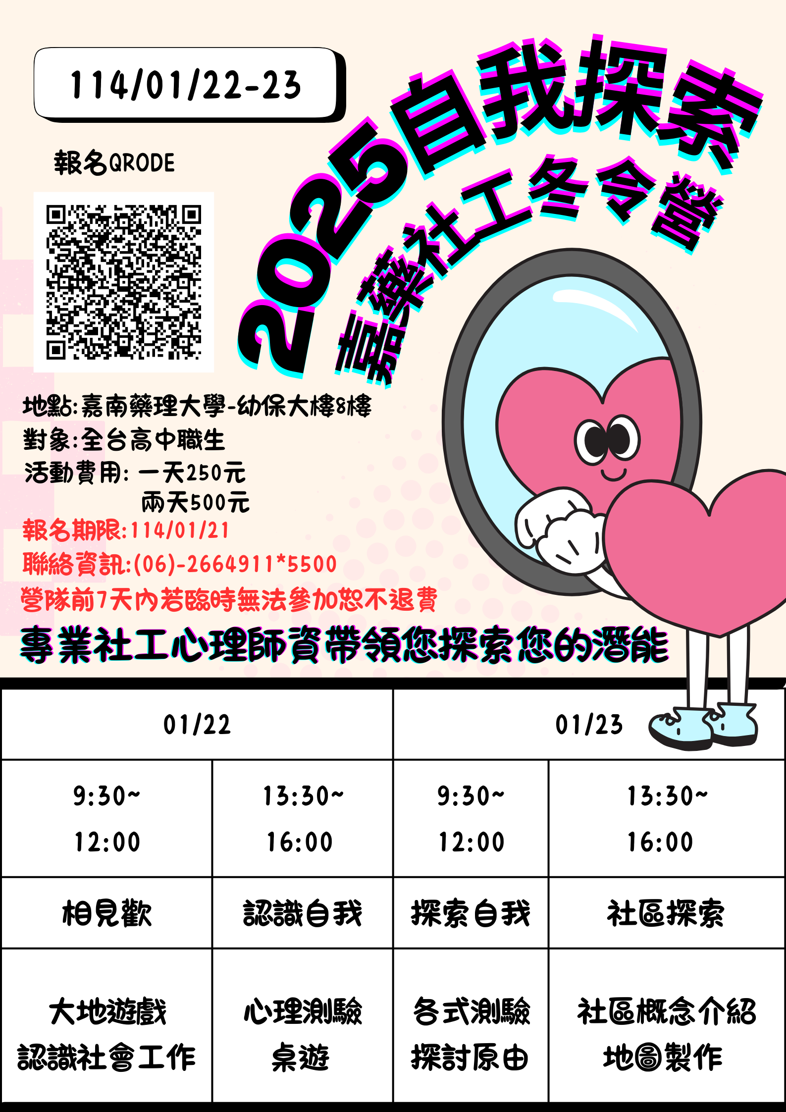 轉知嘉南藥理大學推廣教育中心謹訂於114年1月22、23日辦理 「2025嘉藥社工冬令營」