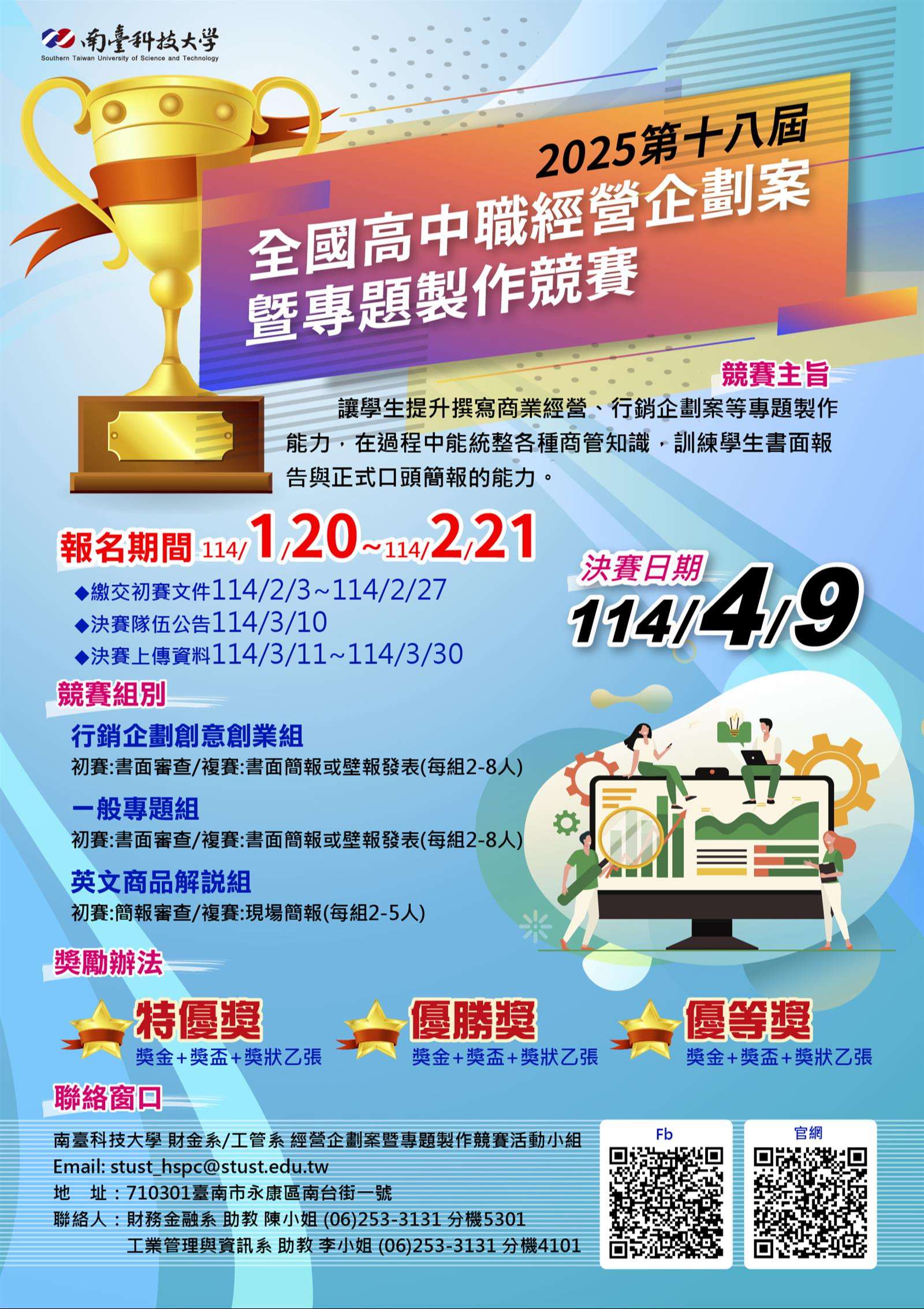轉知南臺科技大學商管學院訂於114年4月9日(星期三)舉辦「2025第十八屆全國高中職經營企劃案暨專題製作競賽」
