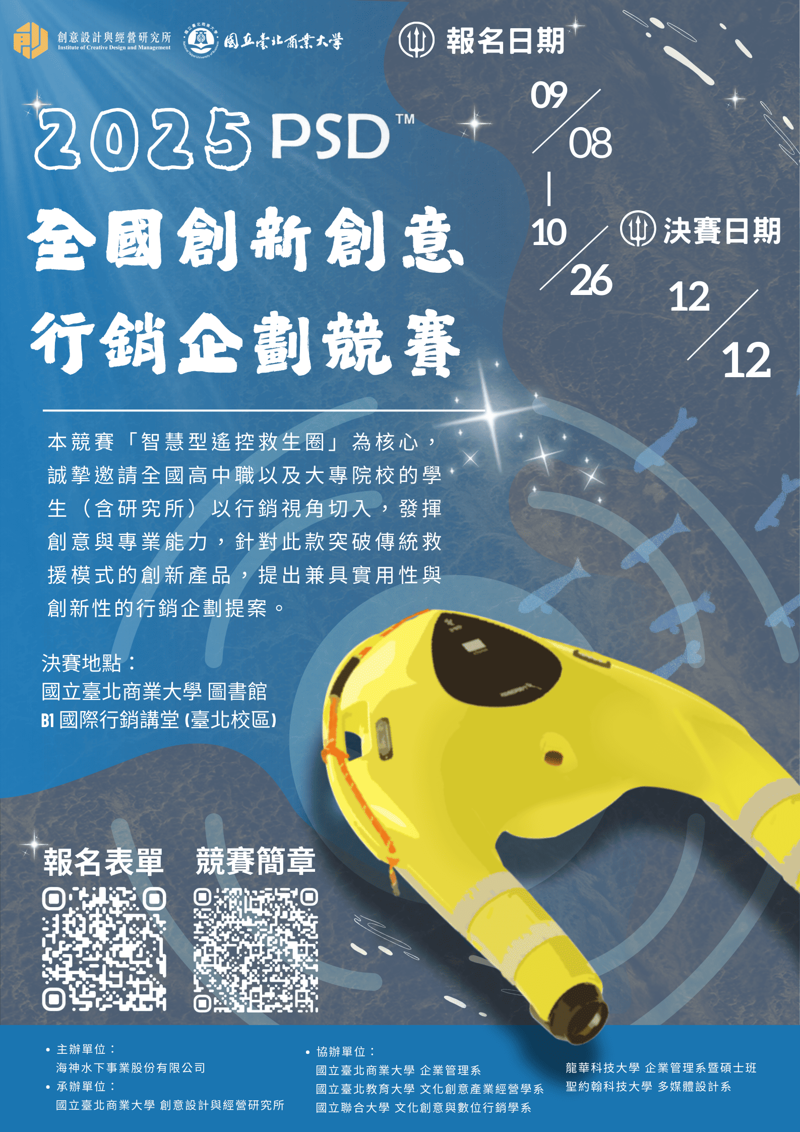 轉知國立臺北商業大學創意設計與經營研究所承辦海神水下事業股份有 限公司之「2025 PSD全國創新創意行銷企劃競賽」活動辦法更新