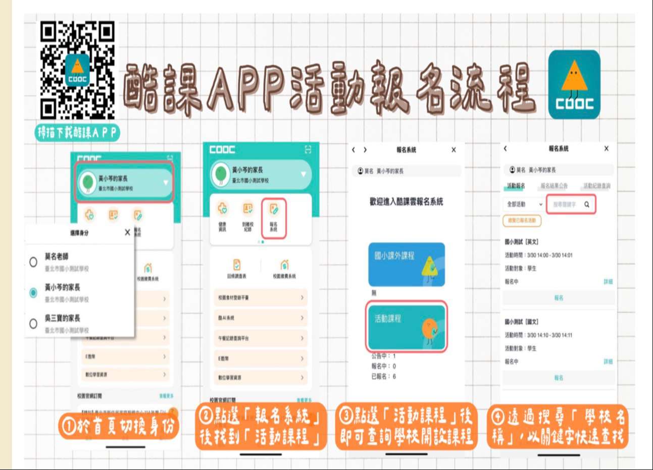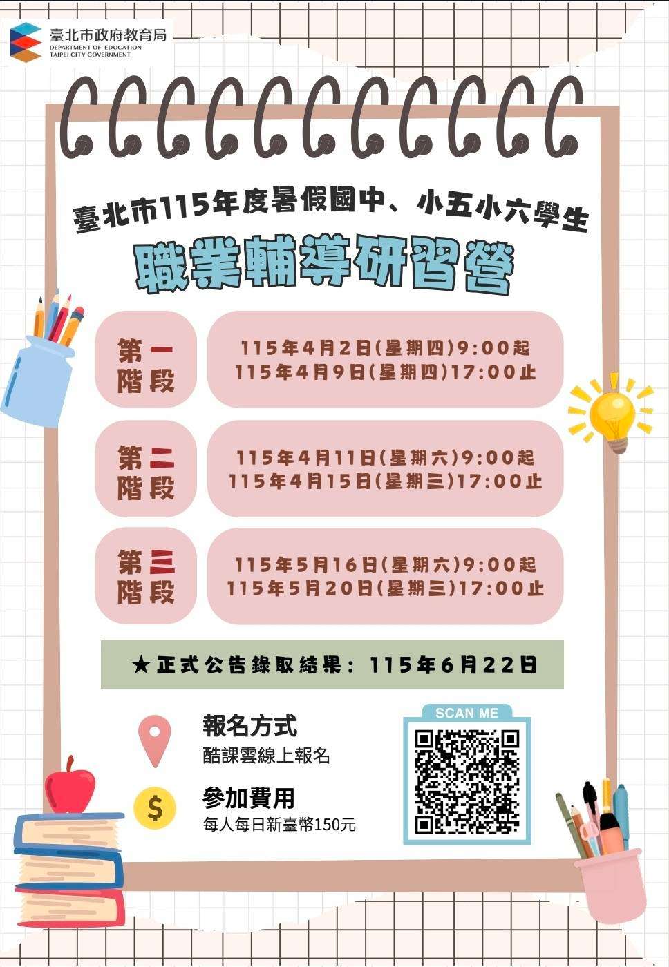 三、 報名方式:國中115暑假職業輔導營採本市「酷課APP」自行報名並繳費。可家長代報或學生自行報名(家長代報須完成親子綁定,才可幫綁定之子女進行報名)。請預先備妥「單一身分驗證服務」(網址:https://ldap.tp.edu.tw)帳號以利報名;倘欲查詢「單一身分驗證」帳號,請洽本校(22309585)分機720。