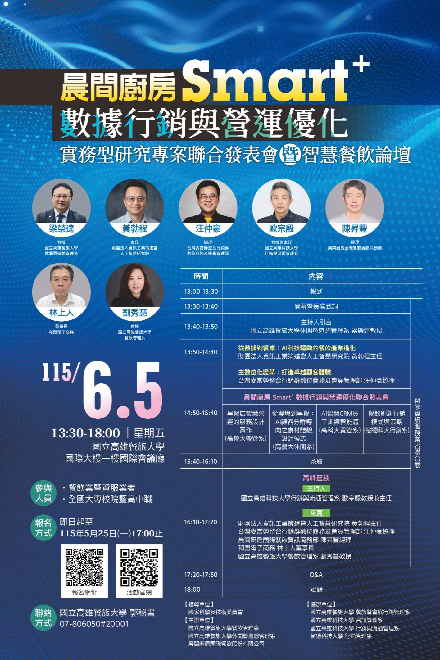 轉知高雄餐旅大學飲管理系舉辦晨間廚房 Smart+ 數據行銷與營運優化-實務型研究專案聯合發表會暨智慧餐飲論壇