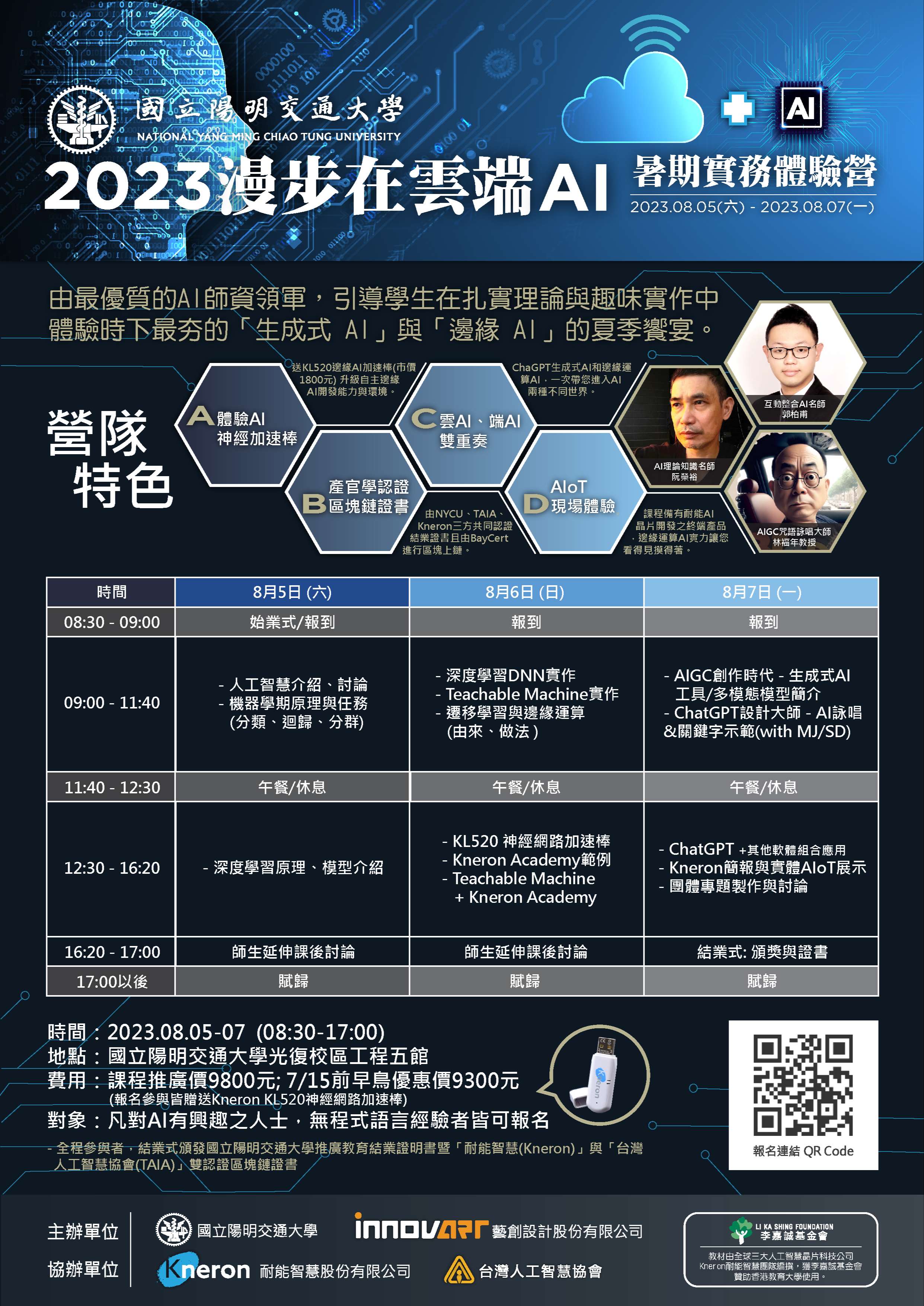 三、營隊特色:A. 體驗AI神經加速棒;B. 產官學三方認證區塊鏈證書;C.「雲AI」與「端AI」雙重奏;D. AIoT現場體驗。