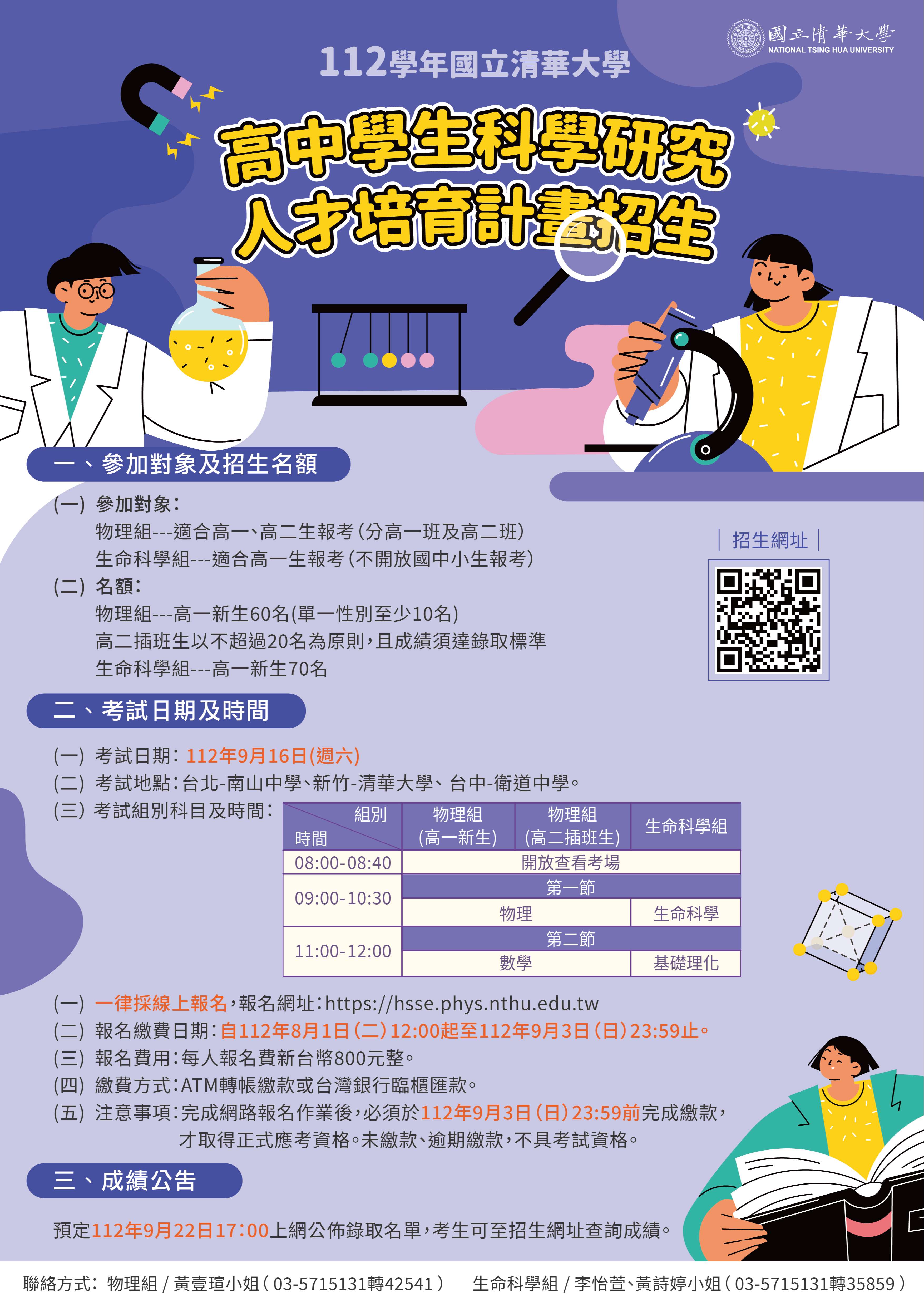 三、報名期間自112年8月1日(二)12:00起至112年9月3日(日) 23:59止,簡章及報名網址請詳見: https://hsse.phys. nthu.edu.tw/。