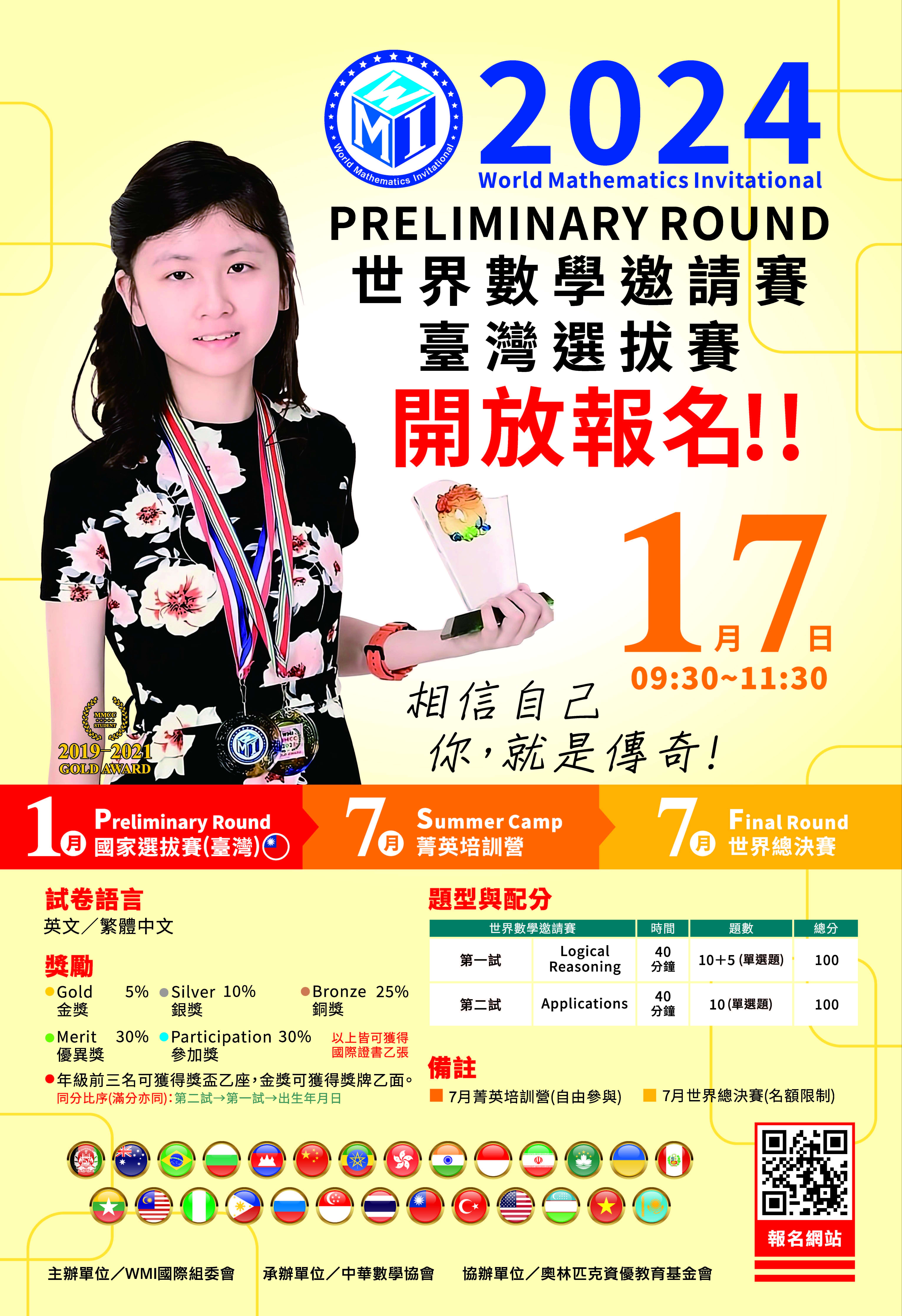 主旨:中華數學協會為推廣數學,謹訂於2024年1月7日(星期日)舉辦 「WMI世界數學邀請賽-2024臺灣選拔賽」,敬請 貴校公 告並推薦學生參加競賽,以提升數學教育,歡迎共襄盛 舉,與國際數學接軌,發掘優秀人才,為國爭光。請 鑒 核。