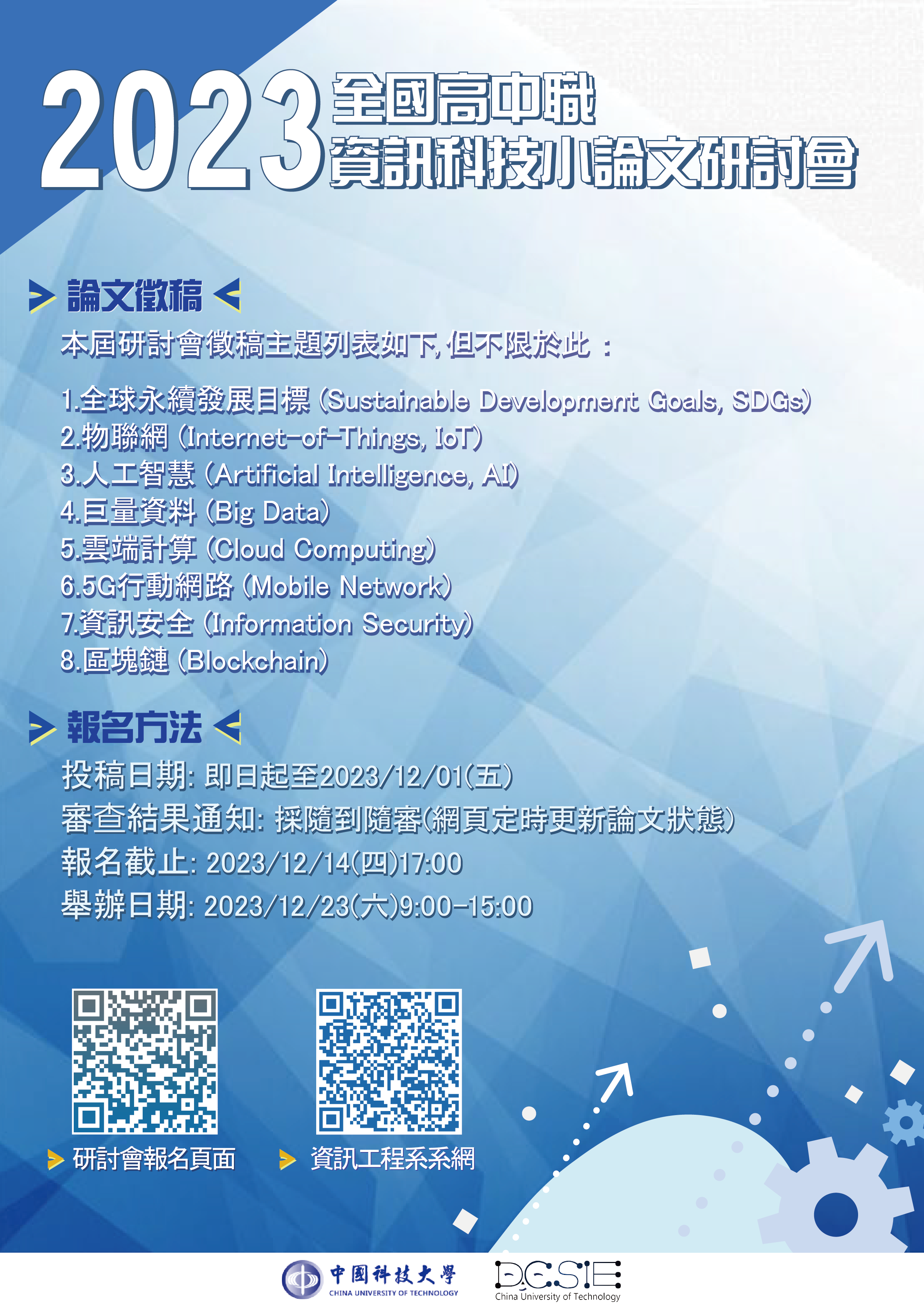 一、2023全國高中職資訊科技小論文研討會訂於2023年11月25 日(星期六)於中國科技大學台北校區舉行,歡迎全國高中 職學生踴躍投稿。 二、本研討會接受以中文或英文撰寫之摘要或全文投稿,審查 通過後,可以用中文、英文口頭發表或海報張貼發表論文 內容,並給予發表證明。唯稿件須具原創性,未曾發表之 小論文。 三、本研討會將從全文投稿論文中,選出數篇最佳論文,並頒 發獎狀,以玆鼓勵