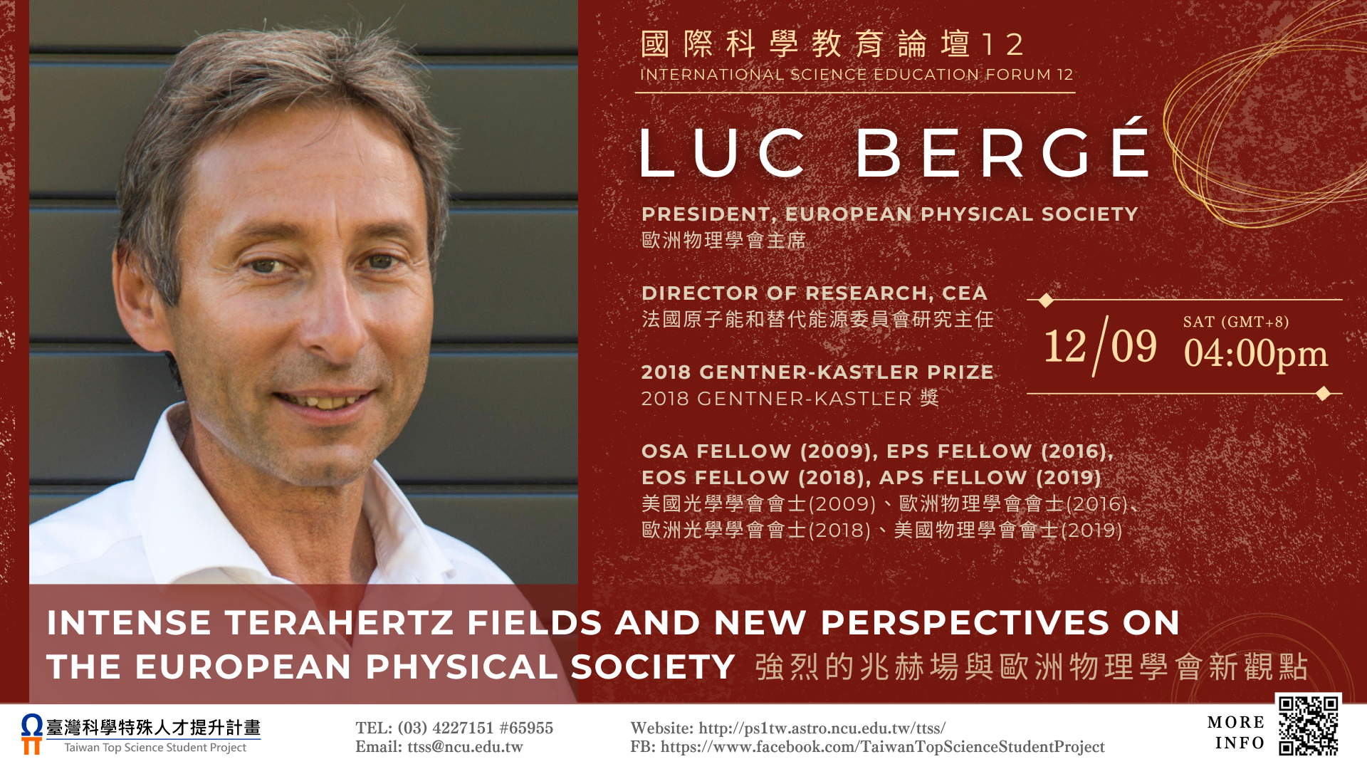 一、Dr. Luc Bergé 是一名法國原子能和替代能源委員會的理 論物理學家。他的成就明確地顯示,他是非線性波傳播、 飛秒雷射絲化、太赫茲脈衝生成及相關應用領域的世界級 先鋒和領導者。他同時是歐洲物理學會主席、法國原子能 和替代能源委員會研究主任,這次他以「Intense terahertz fields and new perspectives on the European Physical Society」主講,內容將涵蓋兆赫場研 究及歐洲物理學會對歐洲物理教育的一些新觀點。