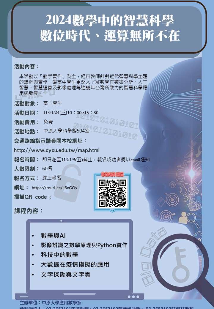 主旨:檢送中原大學應用數學系於113年1月24日舉辦「2024數學中的 智慧科學」活動簡章及海報各1份,請惠予公告並鼓勵貴 校學生踴躍報名參加,請查照。