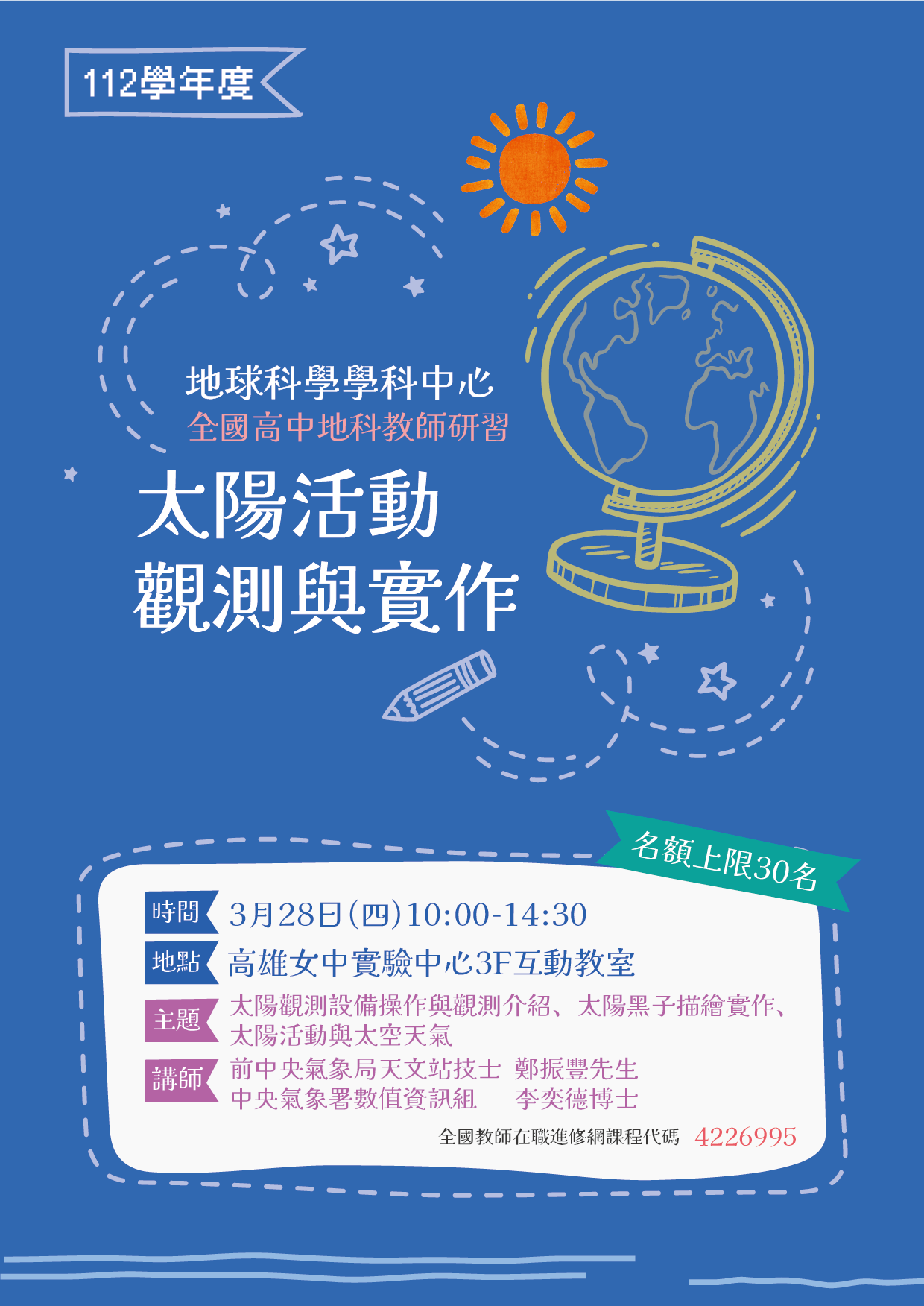 五、報名方式:即日起至113年3月24日止請至全國教師在職進 修網(https://www5.inservice.edu.tw)報名,課程代 碼:4226995。