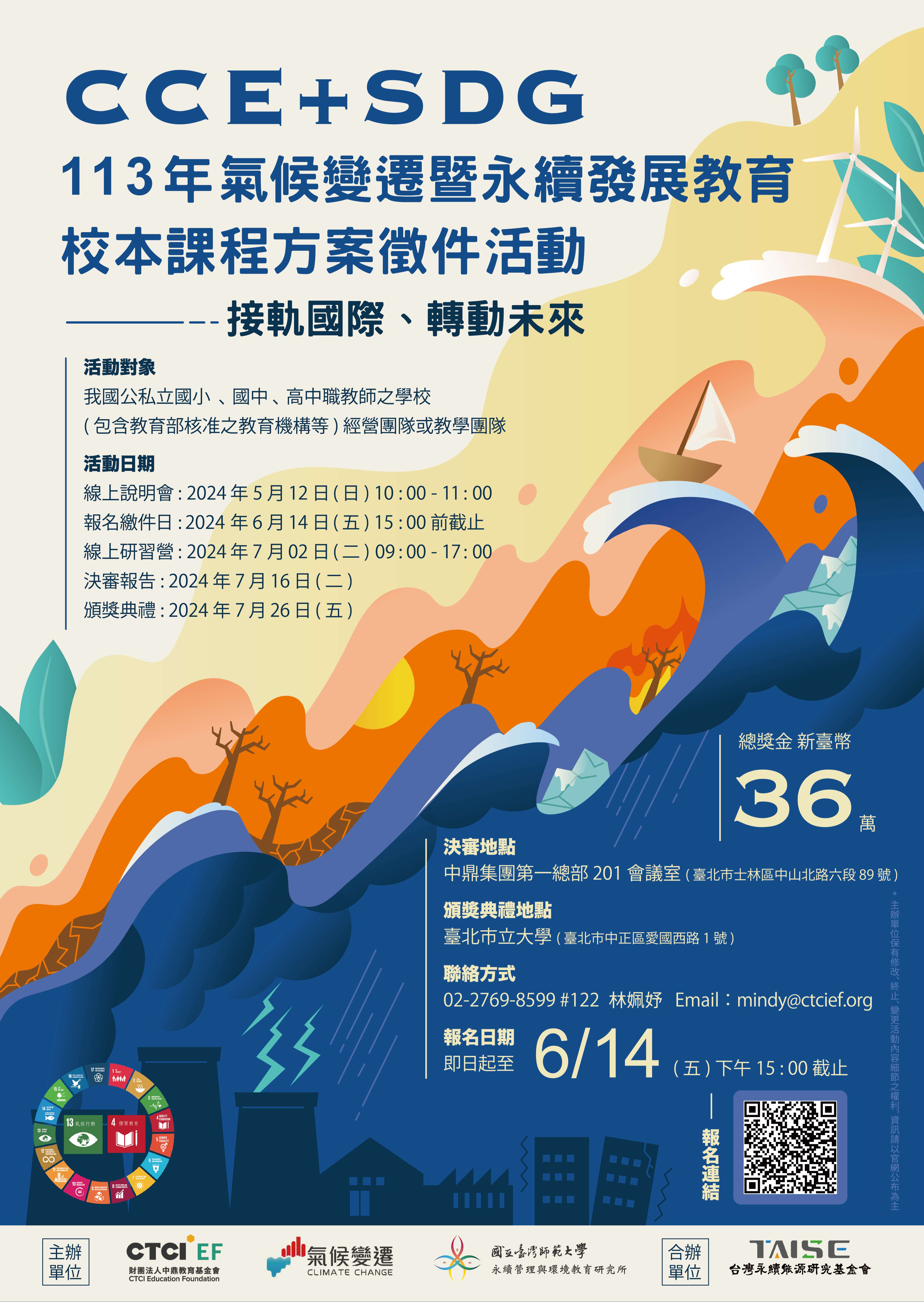 主旨:敬邀 貴校推派代表報名參加「CCESDG接軌國際、轉動未 來-113年氣候變遷暨永續發展教育校本課程方案徵件活 動」,請查照周知。