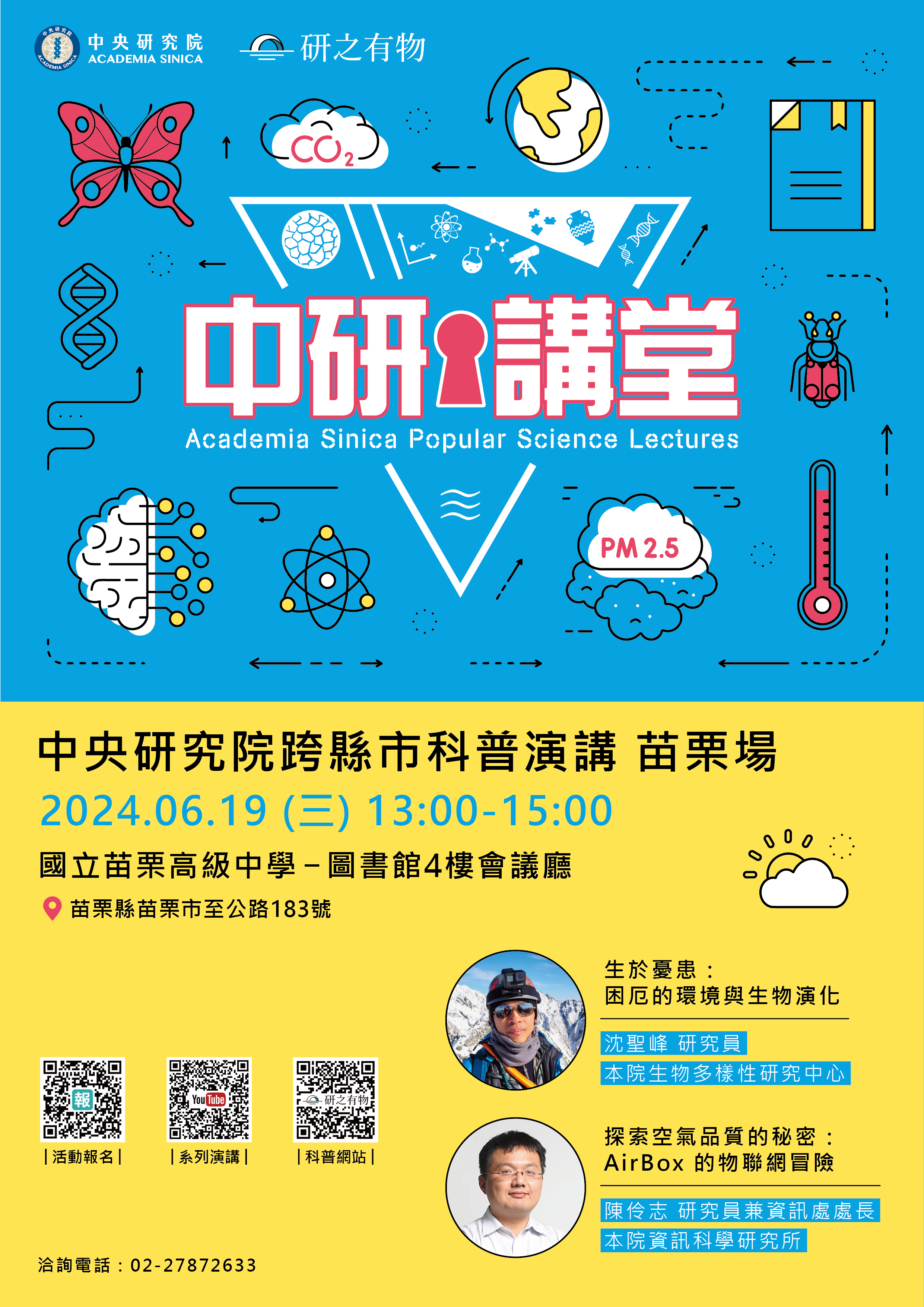 主旨:中央研究院訂於6月19日(星期三)下午於國立苗栗高級中學圖 書館舉辦「中研講堂」苗栗場科普演講,敬邀報名參加, 請惠予公告周知。