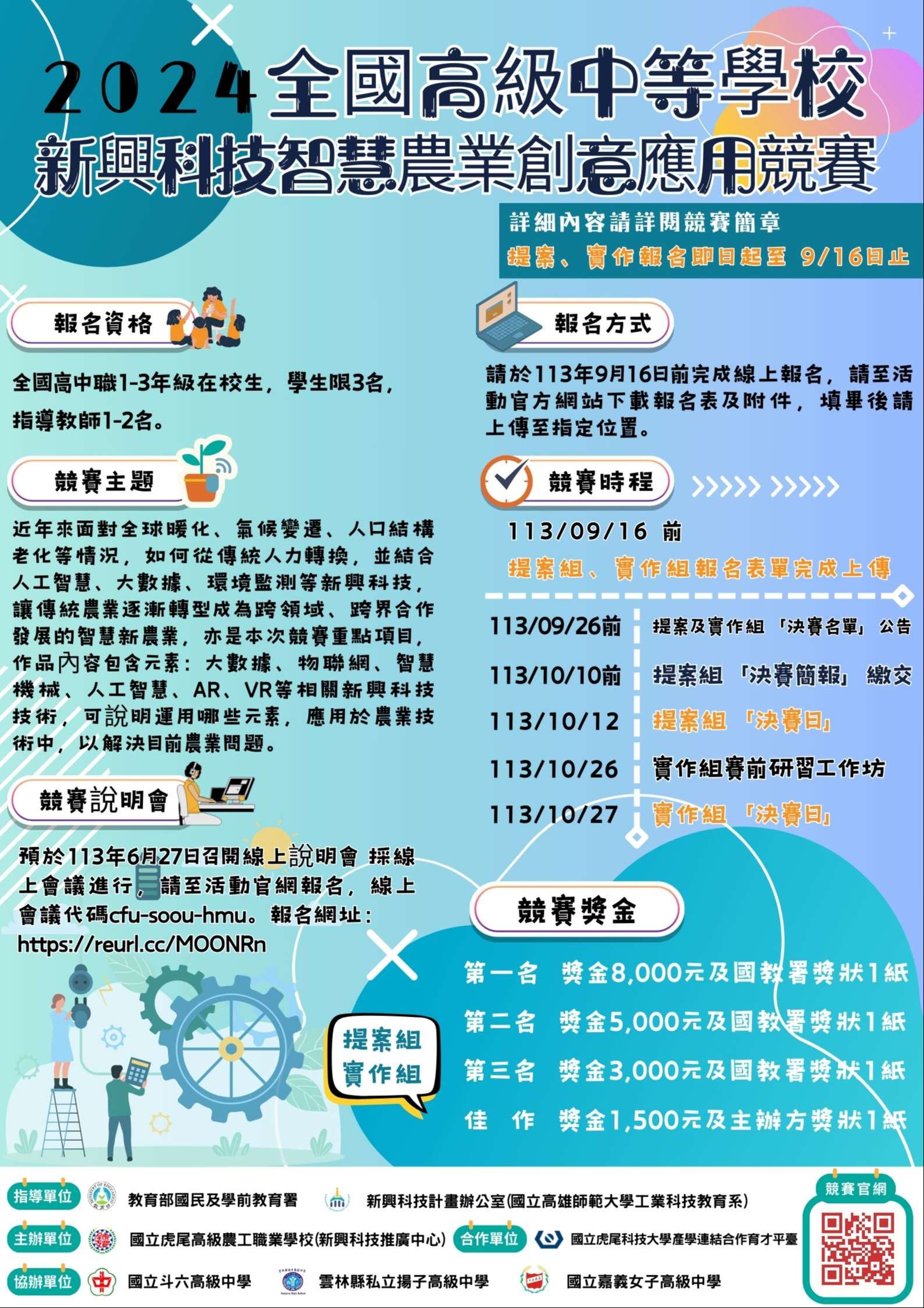 一、依據該校113年6月25日虎農教字第1130200160號函辦理。 二、面對全球暖化、氣候變遷、人口結構老化等情況,從傳統 人力轉換,結合人工智慧、環境監測、綠能等新興技術, 讓傳統農業漸進式轉型成為跨領域、跨資源合作發展的智 慧新農業。該校特辦理旨揭競賽期透過參賽作品創意發想 設計結合運用新興科技議題,並應用於農業技術中,以解 決目前農業問題。 三、旨揭競賽資訊如下: (一)競賽對象:全國公、私立高中職在學學生。 (二)競賽模式:「提案組」及「實作組」(三)競賽獎金:第1名8,000元整、第2名5,000元整、第3名 3,000元整及佳作6名各1,500元整。 (四)報名方式:採線上報名,請參賽者於113年9月16日(星 期一)前將報名資料上傳至競賽官網(網址: https://reurl.cc/13G3yV。)。 (五)競賽地點:國立虎尾高級農工職業學校第二校區。 四、檢附競賽簡章及活動海報各1份,如有疑義,逕洽該校新興 科技推廣中心黃主任,電話:05-6322767轉481;電子郵 件信箱:technlogy@hwaivs.ylc.edu.tw