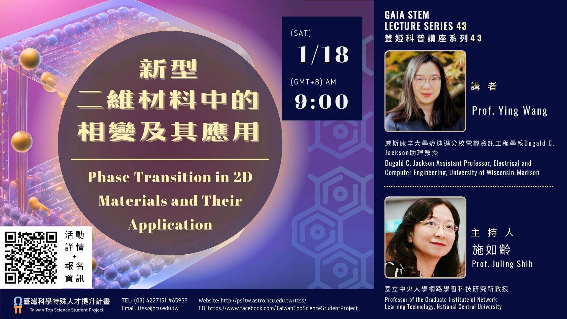 主旨:國立中央大學訂於114年1月18日辦理線上講座:《蓋婭科普講座系 列 43》—— 「新型二維材料中的相變及其應用」,請惠 予公告,並轉知貴校所屬師生踴躍報名參加,請查照。