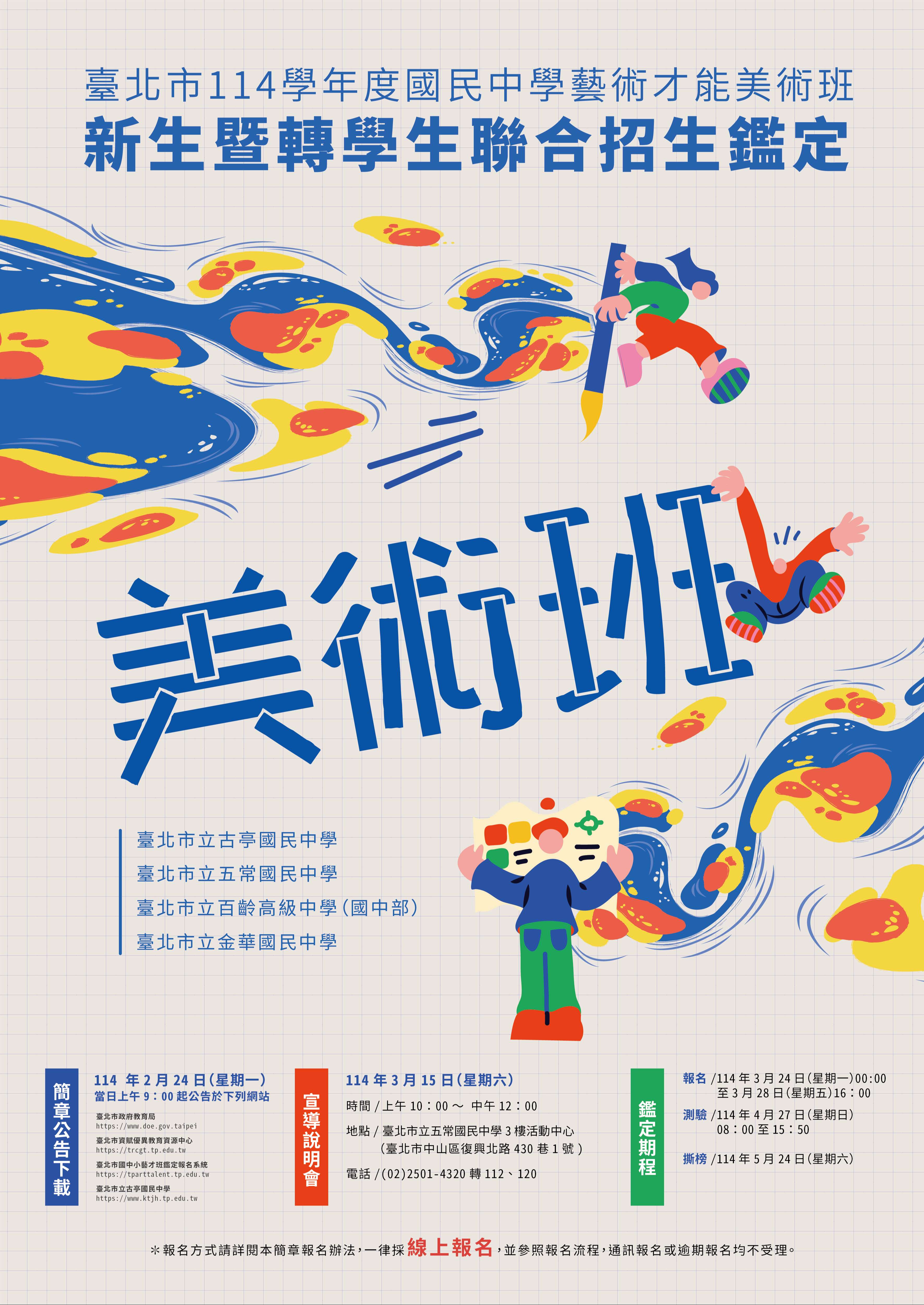 主旨:檢送臺北市114學年度國民中學藝術才能美術班新生暨轉學生聯合招生鑑定海報電子檔1份,敬請惠予公告,請查照。