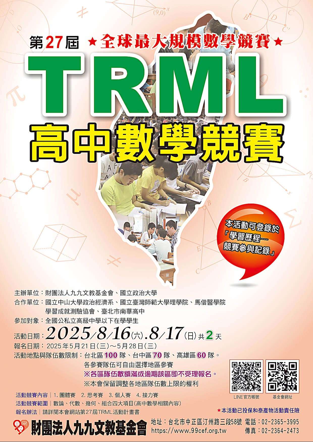 主旨:財團法人九九文教基金會訂於民國114年8月16、17日(星期六、日)舉辦第27屆TRML高中數學競賽,敬請 貴校鼓勵學生報名參加,參賽 成績優異之學生與指導教師,依例酌予敘獎鼓勵。