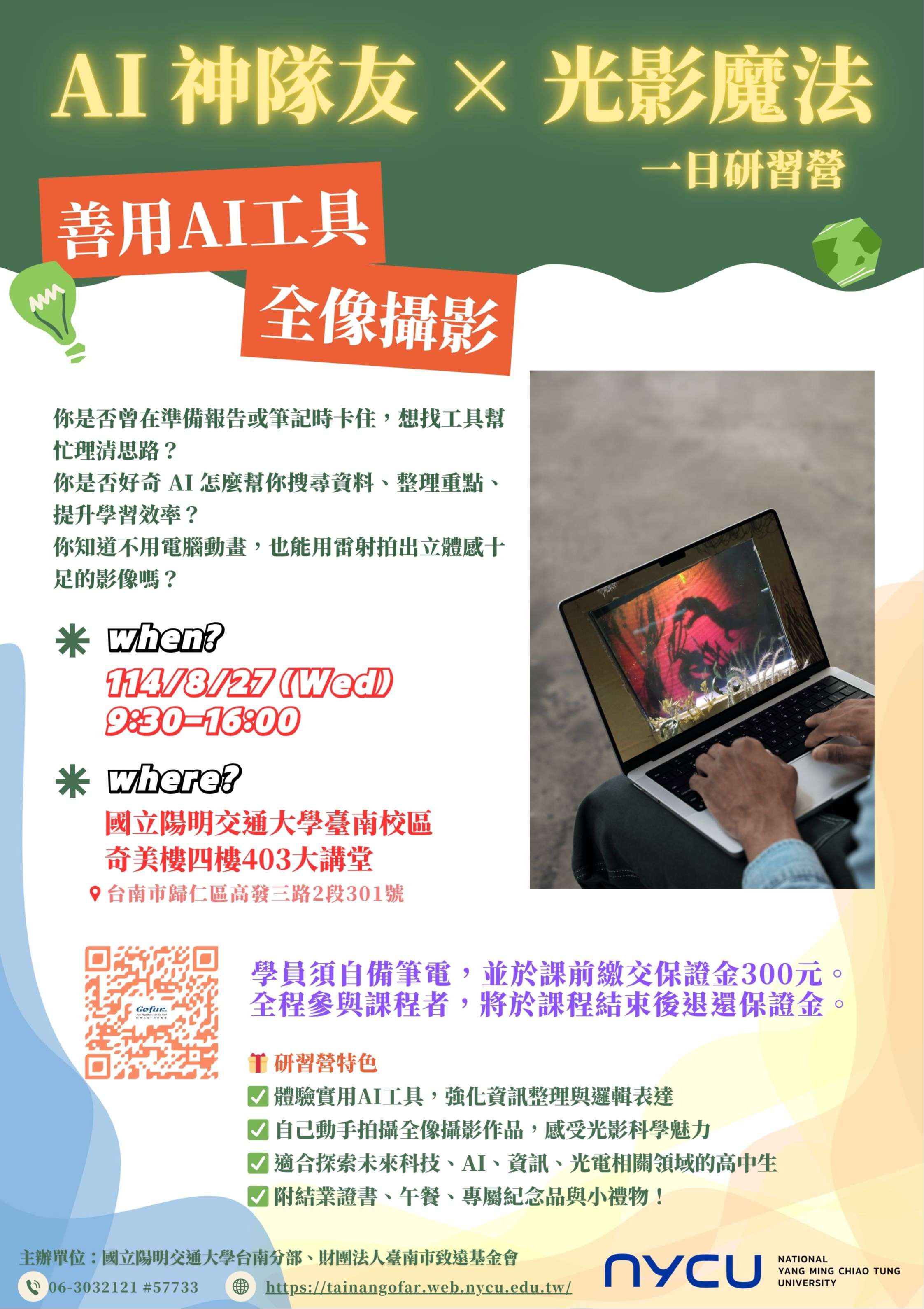主旨:國立陽明交通大學謹訂於114年8月27日舉辦「科普講座系列_ AI神隊友 × 光影魔法全像攝影日一日研習營」,活動資訊詳如 說明,敬請貴校惠予公告周知,並鼓勵貴校同學踴躍參 加,請查照。